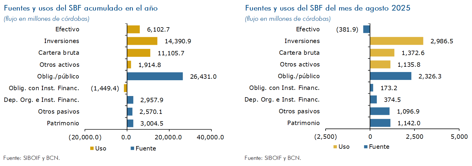 Por su parte, en el acumulado a agosto de 2025, el SBF ha obtenido recursos especialmente a través del aumento de las obligaciones con el público (C$26,431.0 millones). Dichos recursos fueron destinados al incremento de las inversiones (C$14,390.9 millones), de la cartera de créditos (C$11,105.7 millones) y del efectivo (C$6,102.7 millones).