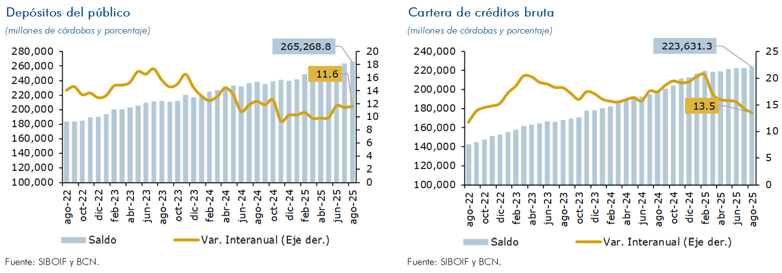 Al cierre de agosto de 2025, los depósitos del público registraron un crecimiento de 11.6 por ciento en términos interanuales (saldo de C$265,268.8 millones); mientras la cartera de crédito aumentó en 13.5 por ciento (saldo de C$223,631.3 millones). Las entregas de crédito mantuvieron los buenos resultados registrados en la calidad de la cartera, así, la proporción de la cartera vigente se mantuvo en 95.6 por ciento de la cartera bruta total, mientras el ratio de cartera en mora resultó en 1.1 por ciento (1.6% en agosto de 2024).