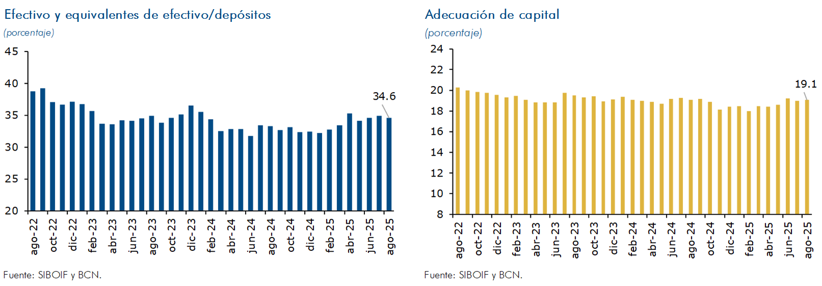 En agosto de 2025, la liquidez del Sistema Bancario y Financieras (SBF), medida como el ratio de efectivo y equivalentes de efectivo sobre depósitos del público, registró un valor de 34.6 por ciento. El encaje legal (medición catorcenal), registró un sobrecumplimiento, tanto en córdobas como en dólares. Así, la tasa efectiva de fin de mes se ubicó en 16.7 por ciento en moneda nacional y 15.7 por ciento en moneda extranjera. Por su parte, el SBF finalizó agosto con un ROE de 13.4 por ciento (12.4% en agosto 2024) y un ROA de 2.3 por ciento (2.2% en agosto 2024). La adecuación de capital del SBF al cierre del mes de agosto fue 19.1 por ciento (19.1% en agosto 2024).