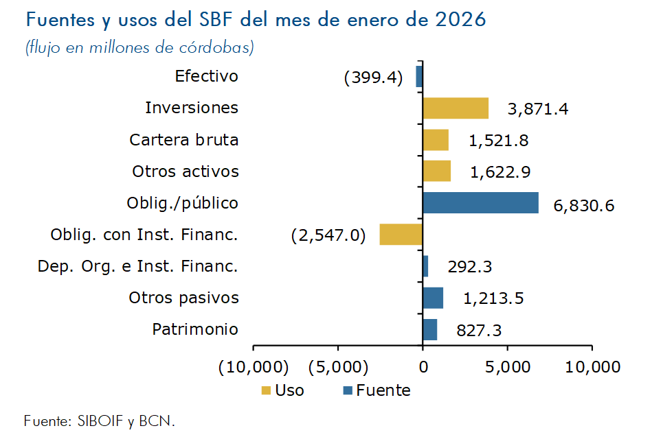 Durante el mes de enero de 2026, el SBF obtuvo recursos principalmente a través del aumento de las obligaciones con el público (C$6,830.6 millones), otros pasivos (C$1,213.5 millones) y el patrimonio (C$827.3 millones). Estos recursos se destinaron al aumento de las inversiones (C$ 3,871.4 millones), de la cartera de créditos (C$ 1,521.8 millones) y de otros activos (C$ 1,622.9 millones), así como, para la reducción de Obligaciones con Instituciones Financieras (C$ 2,547 millones).