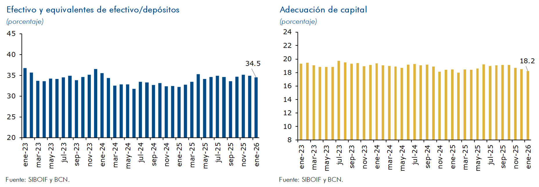 En enero de 2026, la liquidez del Sistema Bancario y Financieras (SBF), medida como el ratio de efectivo y equivalentes de efectivo sobre depósitos del público, registró un valor de 34.5 por ciento. El encaje legal (medición catorcenal), registró un sobrecumplimiento, tanto en córdobas como en dólares. Así, la tasa efectiva de fin de mes se ubicó en 16.0 por ciento en moneda nacional y 15.9 por ciento en moneda extranjera. Por su parte, el SBF finalizó enero con un ROE de 13.1 por ciento (13.9% en enero 2025) y un ROA de 2.3 por ciento (2.4% en enero 2025). Finalmente, la adecuación de capital del SBF al cierre del mes de enero fue de 18.2 por ciento (18.5% en enero 2025).