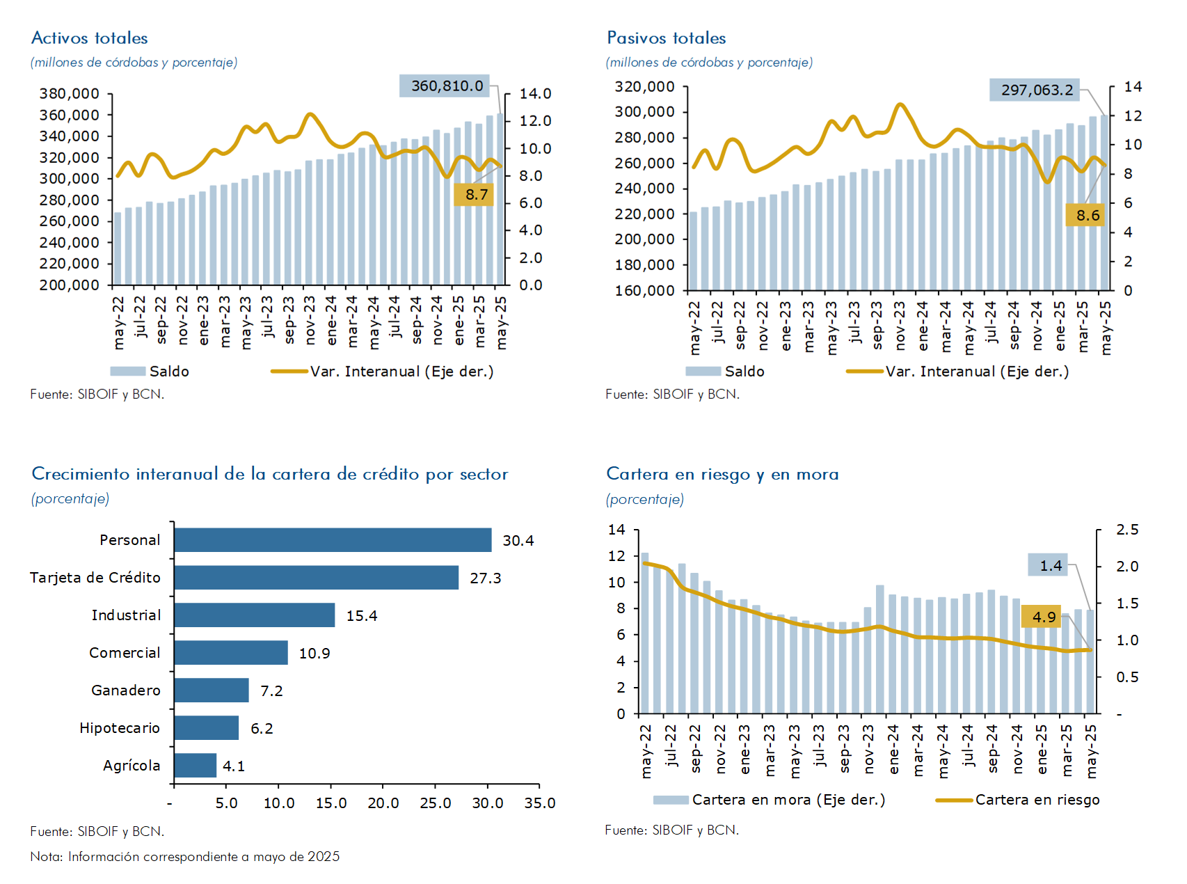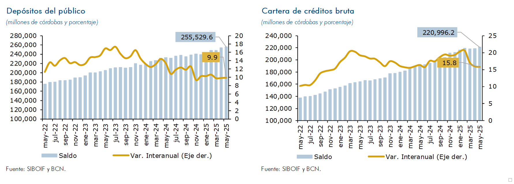 Al cierre de mayo de 2025, los depósitos del público registraron un crecimiento de 9.9 por ciento en términos interanuales (saldo de C$255,529.6 millones); mientras la cartera de crédito aumentó en 15.8 por ciento (saldo de C$220,996.2 millones). Las entregas de crédito mantuvieron los buenos resultados registrados en la calidad de la cartera, así, la proporción de la cartera vigente se mantuvo en 95.1 por ciento de la cartera bruta total, mientras el ratio de cartera en mora resultó en 1.4 por ciento (1.6% en mayo de 2024).