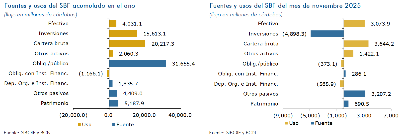 Por su parte, en el acumulado a noviembre de 2025 el SBF ha obtenido recursos especialmente a través del aumento de obligaciones con el público (C$ 31,655.4 millones) y del patrimonio (C$5,187.9 millones). El principal uso de estos fondos ha sido el incremento de la cartera bruta (C$ 20,217.3 millones) y de las inversiones (C$ 15,613.1 millones).