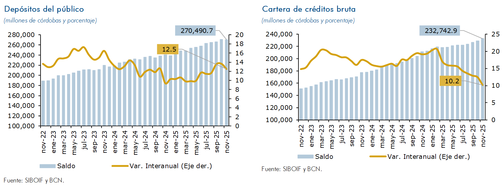 Al cierre de noviembre de 2025, los depósitos del público registraron un crecimiento de 12.5 por ciento en términos interanuales (saldo de C$270,490.7 millones); mientras la cartera de crédito aumentó en 10.2 por ciento (saldo de C$232,742.9 millones). Las entregas de crédito mantuvieron los buenos resultados registrados en la calidad de la cartera, así, la proporción de la cartera vigente se mantuvo en 95.7 por ciento de la cartera bruta total, mientras el ratio de cartera en mora se ubicó en 1.2 por ciento (1.6% en noviembre de 2024).