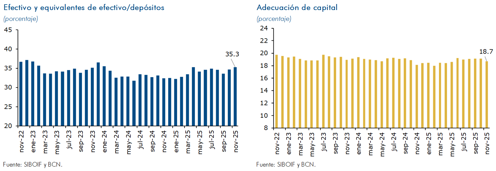 En noviembre de 2025, la liquidez del Sistema Bancario y Financieras (SBF), medida como el ratio de efectivo y equivalentes de efectivo sobre depósitos del público, registró un valor de 35.3 por ciento. El encaje legal (medición catorcenal), registró un sobrecumplimiento, tanto en córdobas como en dólares. Así, la tasa efectiva de fin de mes se ubicó en 15.4 por ciento en moneda nacional y 15.4 por ciento en moneda extranjera. Por su parte, el SBF finalizó noviembre con un ROE de 13.5 por ciento (13.0% en noviembre 2024) y un ROA de 2.3 por ciento (2.3% en noviembre 2024). La adecuación de capital del SBF al cierre del mes de noviembre fue de 18.7 por ciento (18.2% en noviembre 2024).