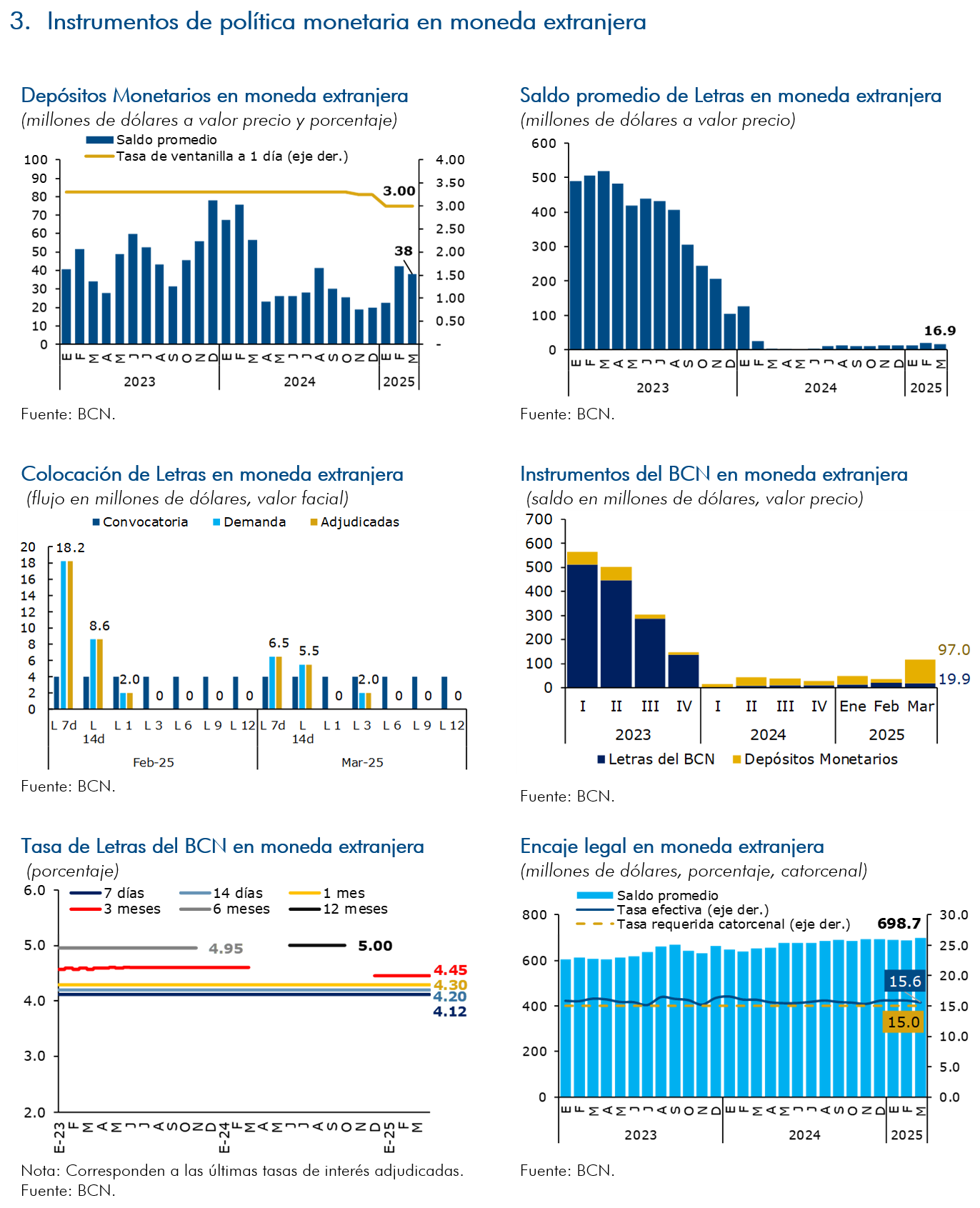 En marzo de 2025, las reservas internacionales brutas (RIB) continuaron aumentando, en la mesa de cambio del BCN se registraron compras netas de divisas, la brecha cambiaria permaneció por debajo de la comisión por venta de divisas, la demanda de instrumentos del BCN mantuvo su dinamismo, la Tesorería General de la República (TGR) trasladó recursos a sus cuentas en el BCN y todos los agregados monetarios registraron crecimiento.