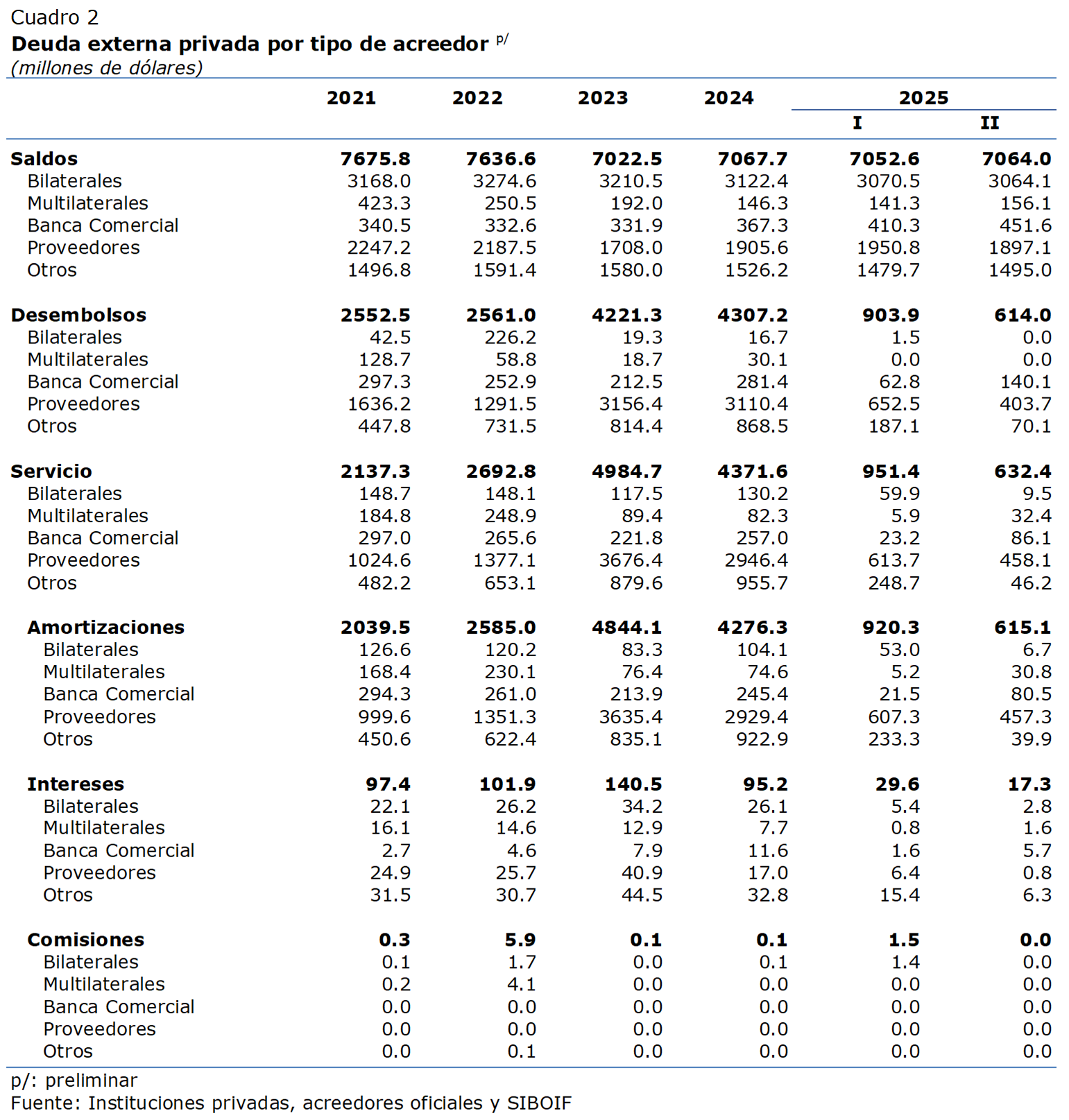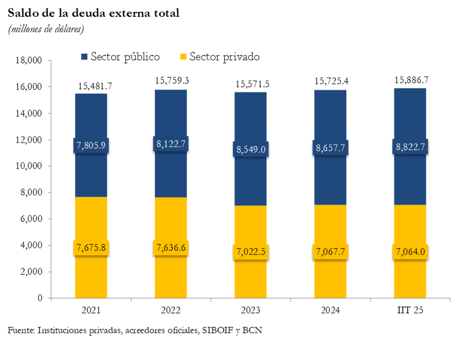 El saldo de la deuda externa total al segundo trimestre 2025 fue de 15,886.7 millones de dólares, de los cuales 55.5 por ciento (US$8,822.7 millones) correspondió al sector público y 44.5 por ciento (US$7,064.0 millones) al sector privado. Del total de la deuda externa, 44.2 por ciento fue deuda con acreedores oficiales multilaterales, 31.1 por ciento con acreedores oficiales bilaterales, 21.8 por ciento con proveedores y otros (incluye créditos comerciales con empresas relacionadas) y 2.9 por ciento con banca comercial.