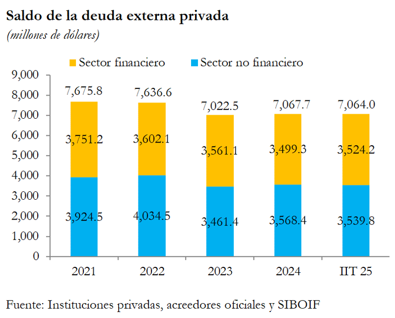 A junio de 2025, la deuda externa privada se ubicó en 7,064.0 millones de dólares, reflejando un aumento de 11.4 millones de dólares (+0.2%) con respecto al trimestre previo (US$ 7,052.6 millones).