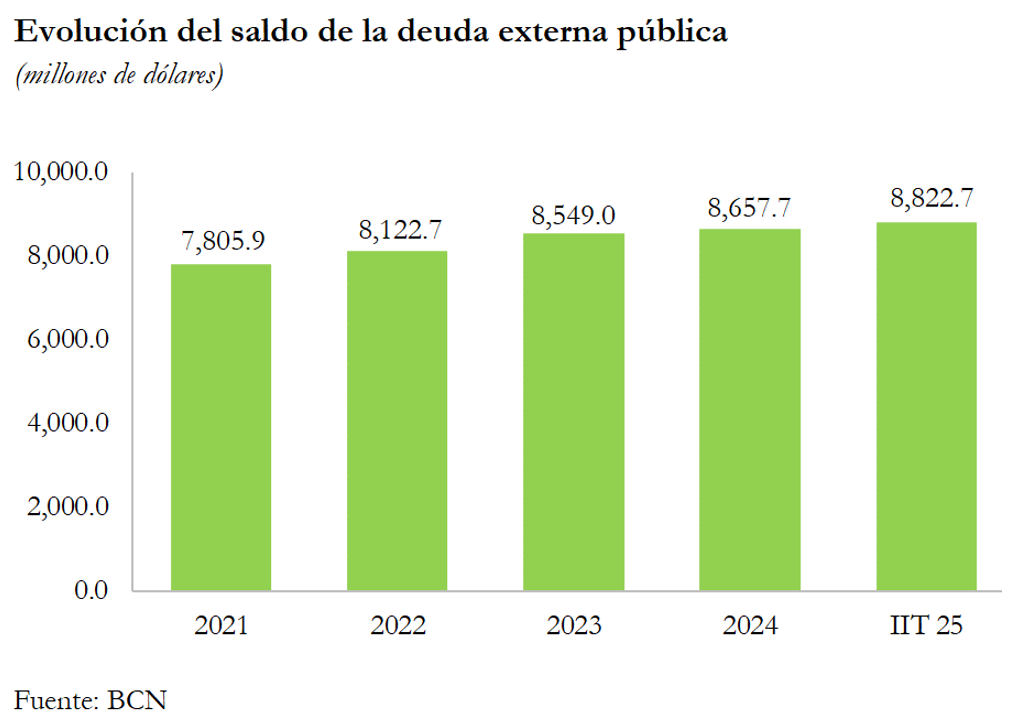 El saldo de la deuda externa pública fue de 8,822.7 millones de dólares a junio de 2025, registrando un incremento de 127.9 millones de dólares (+1.5%) con relación al trimestre anterior (US$8,694.9 millones)
