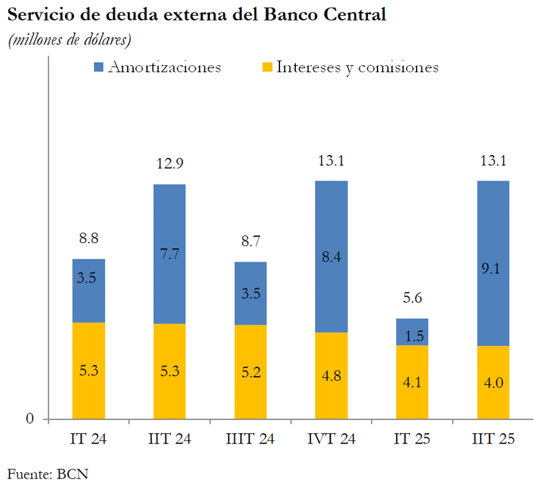 Del total de la deuda, 1,314.7 millones de dólares (71.5%) son préstamos, 516.0 millones de dólares son Asignaciones de Derechos Especiales de Giro (28.1%) y 8.1 millones de dólares son títulos de deuda (0.4%). El servicio pagado de la deuda externa del BCN fue de 13.1 millones de dólares (US$12.9 millones en el mismo período de 2024).