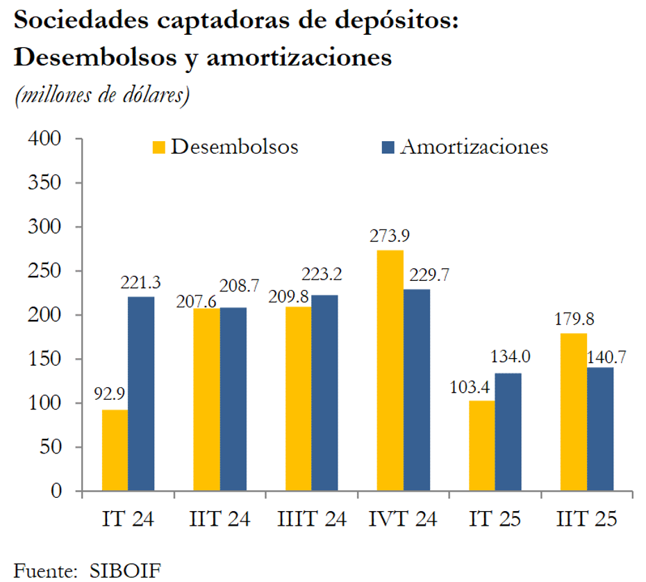 A junio de 2025, la deuda externa de las Sociedades captadoras de depósitos fue de 515.9 millones de dólares, mostrando un aumento de 37.2 millones (+7.8%) respecto al trimestre anterior (US$478.6 millones). En cuanto a la distribución por plazo, 254.7 millones de dólares corresponden a deuda de corto plazo y 261.1 millones a deuda de mediano y largo plazo. Por tipo de instrumento, 483.4 millones de dólares correspondieron a préstamos y 32.4 millones a monedas y depósitos.