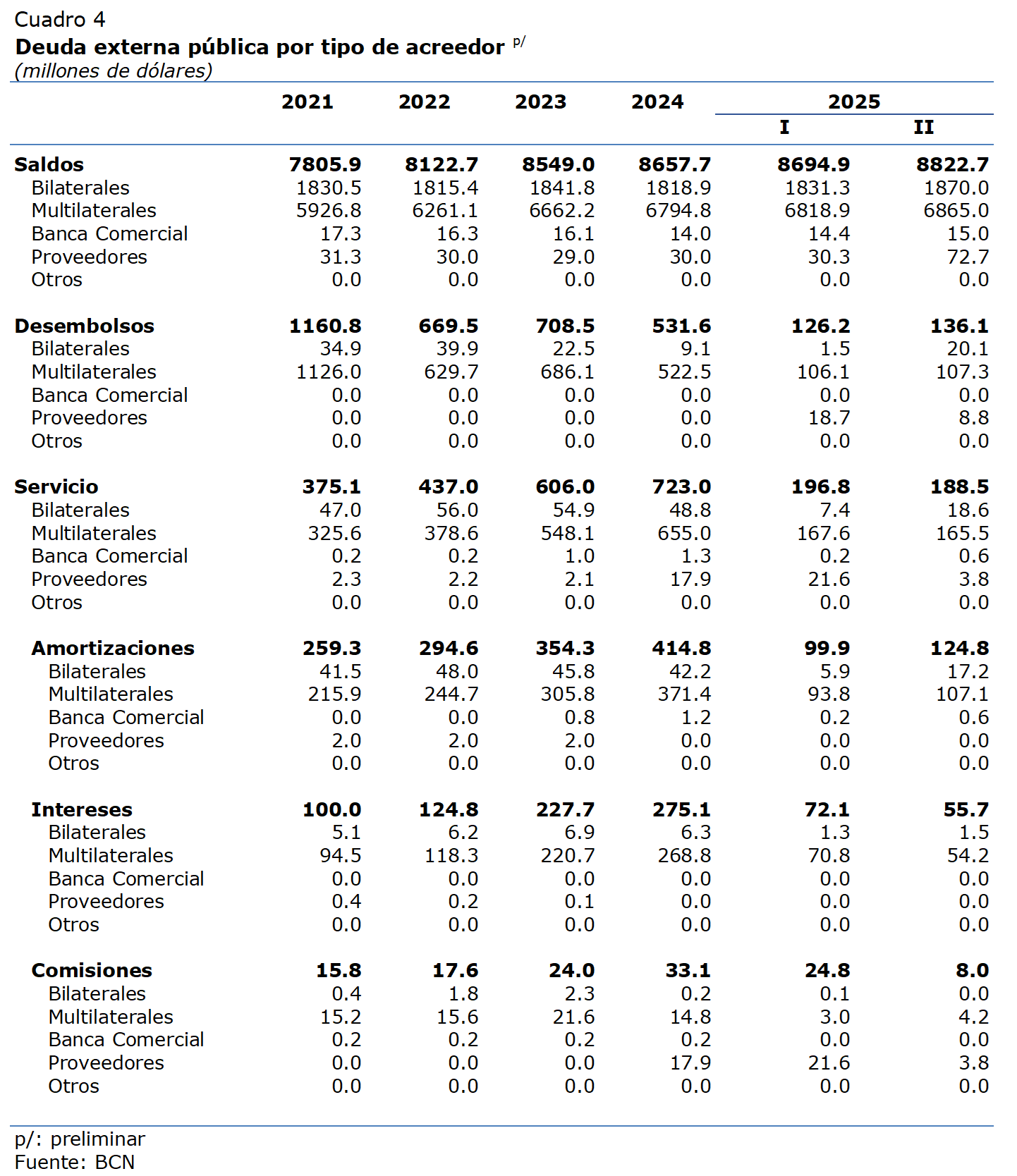 - Los datos de la deuda externa pública no incluyen los depósitos de organismos internacionales en el BCN.