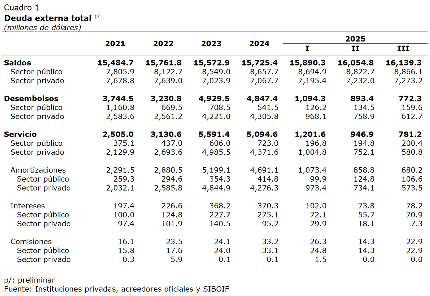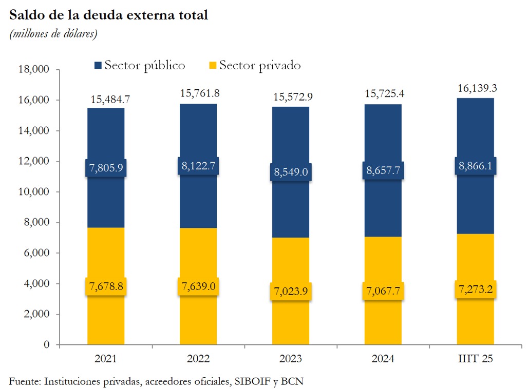 El saldo de la deuda externa total, al tercer trimestre 2025, fue de 16,139.3 millones de dólares, de los cuales 54.9 por ciento (US$8,866.1 millones) correspondió al sector público y 45.1 por ciento (US$7,273.2 millones) al sector privado. Del total de la deuda externa, 43.1 por ciento fue deuda con acreedores oficiales multilaterales, 30.7 por ciento con acreedores oficiales bilaterales, 23.3 por ciento con proveedores y otros (incluye créditos comerciales con empresas relacionadas) y 2.9 por ciento con banca comercial.