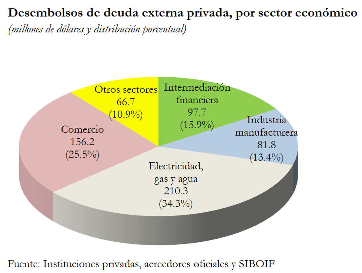 Los desembolsos provinieron en su totalidad de acreedores privados, de los cuales 82.7 por ciento fueron de proveedores y 17.3 por ciento de banca comercial y otros acreedores. Las principales actividades de destino de los desembolsos recibidos por el sector privado fueron: electricidad, gas y agua (34.3%), comercio (25.5%), intermediación financiera (15.9%), industria manufacturera (13.4%), minería (9.1%) y el resto de sectores (1.8%).