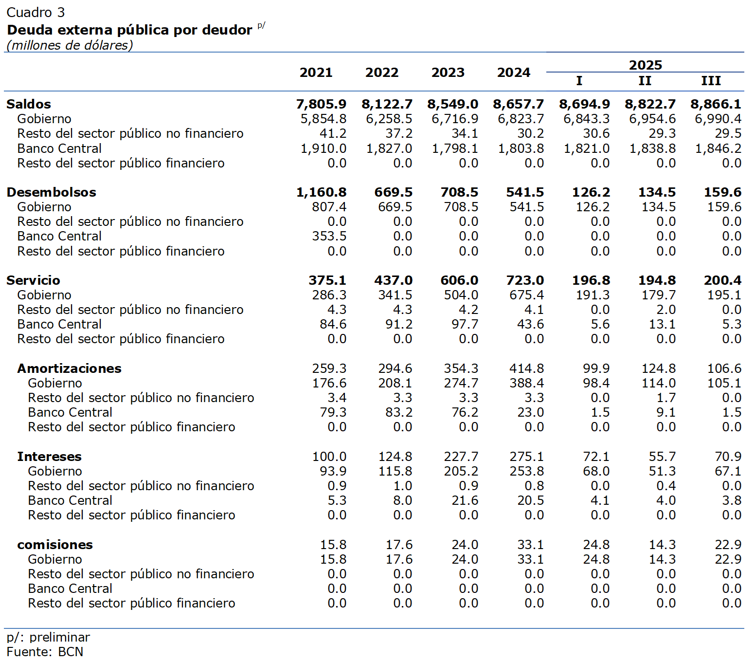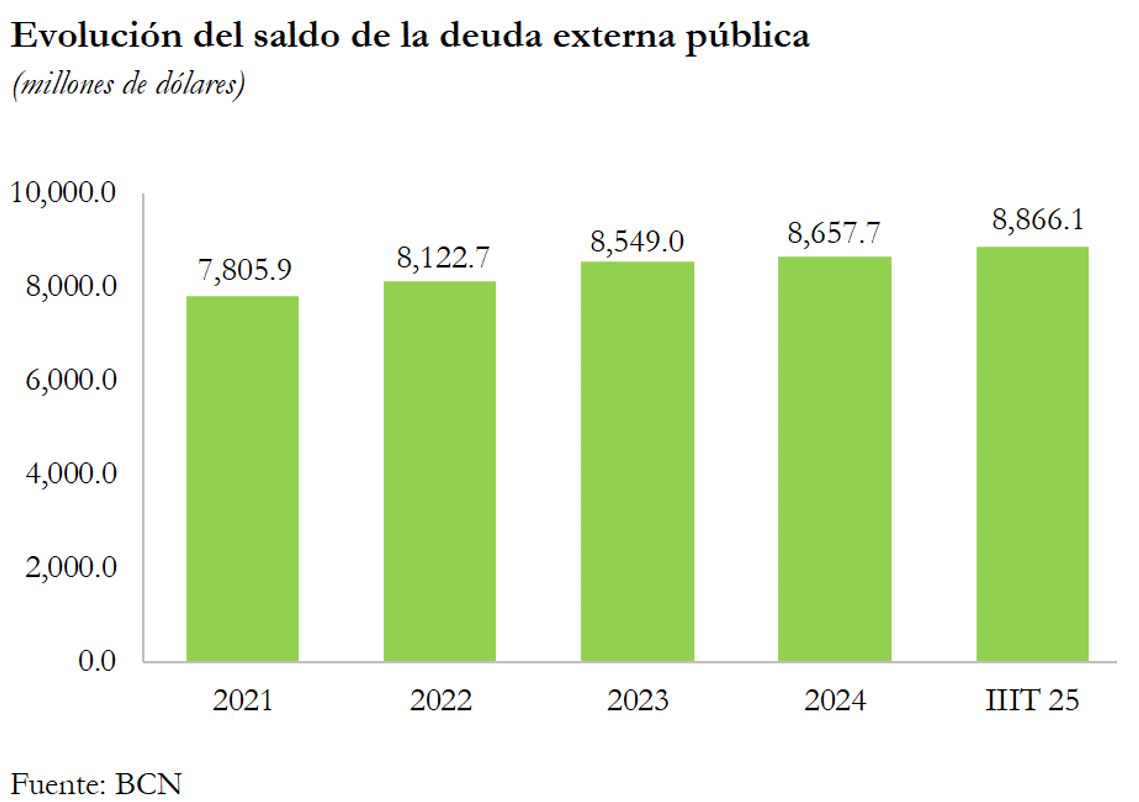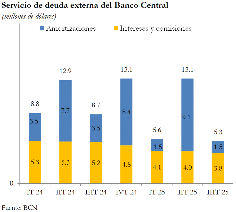 Del saldo total de la deuda, 1,323.2 millones de dólares (71.7%) son préstamos, 514.8 millones de dólares son Asignaciones de Derechos Especiales de Giro (27.9%) y 8.2 millones de dólares son títulos de deuda (0.4%). El servicio pagado de la deuda externa del BCN fue de 5.3 millones de dólares (US$8.7 millones en el mismo período de 2024).