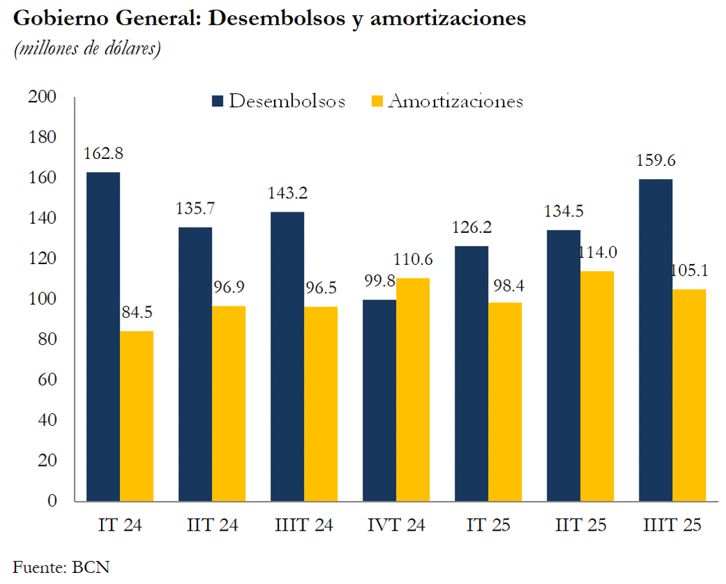 Los desembolsos de préstamos externos recibidos en el tercer trimestre 2025 fueron de 159.6 millones de dólares, siendo mayores en 16.4 millones (+11.5%) con respecto a igual período de 2024 (US$143.2 millones).