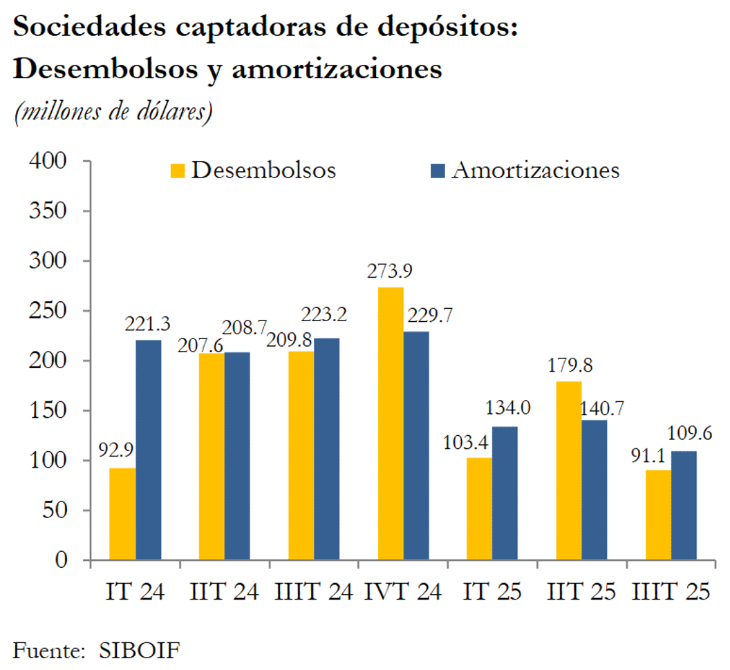 A septiembre de 2025, la deuda externa de las Sociedades captadoras de depósitos fue de 499.2 millones de dólares, mostrando una disminución de 16.6 millones (-3.2%) respecto al trimestre anterior (US$515.9 millones). En cuanto a la distribución por plazo, 222.6 millones de dólares corresponden a deuda de corto plazo y 276.6 millones a deuda de mediano y largo plazo. Por tipo de instrumento, 467.2 millones de dólares correspondieron a préstamos y 32.1 millones a monedas y depósitos.