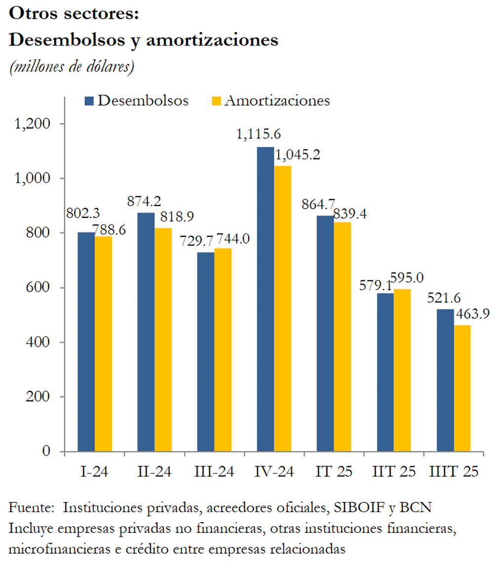 Los desembolsos de deuda externa de Otros Sectores fueron de 521.6 millones de dólares, representando una disminución de 208.1 millones (-28.5%) con respecto al mismo período de 2024 (US$729.7 millones).