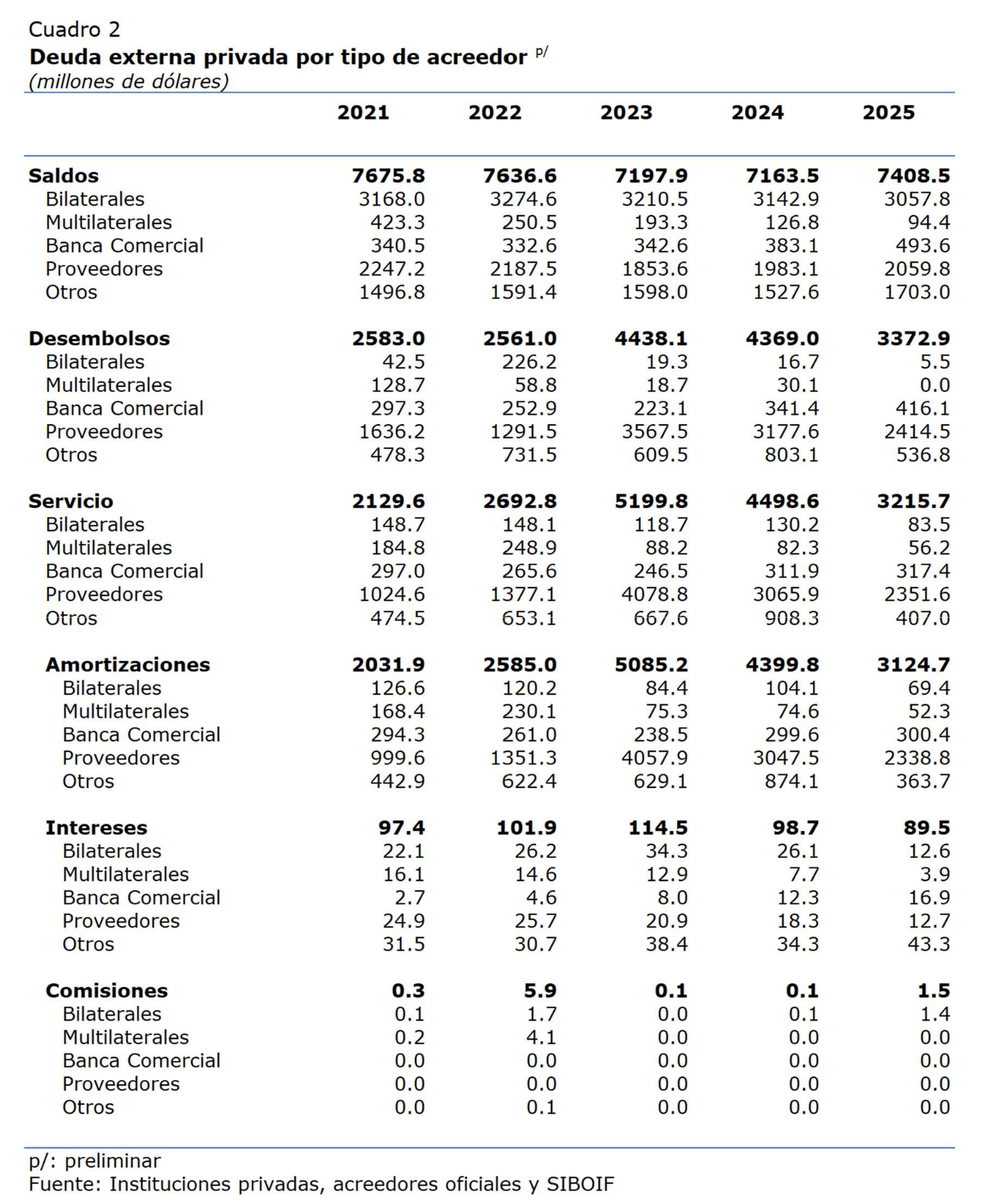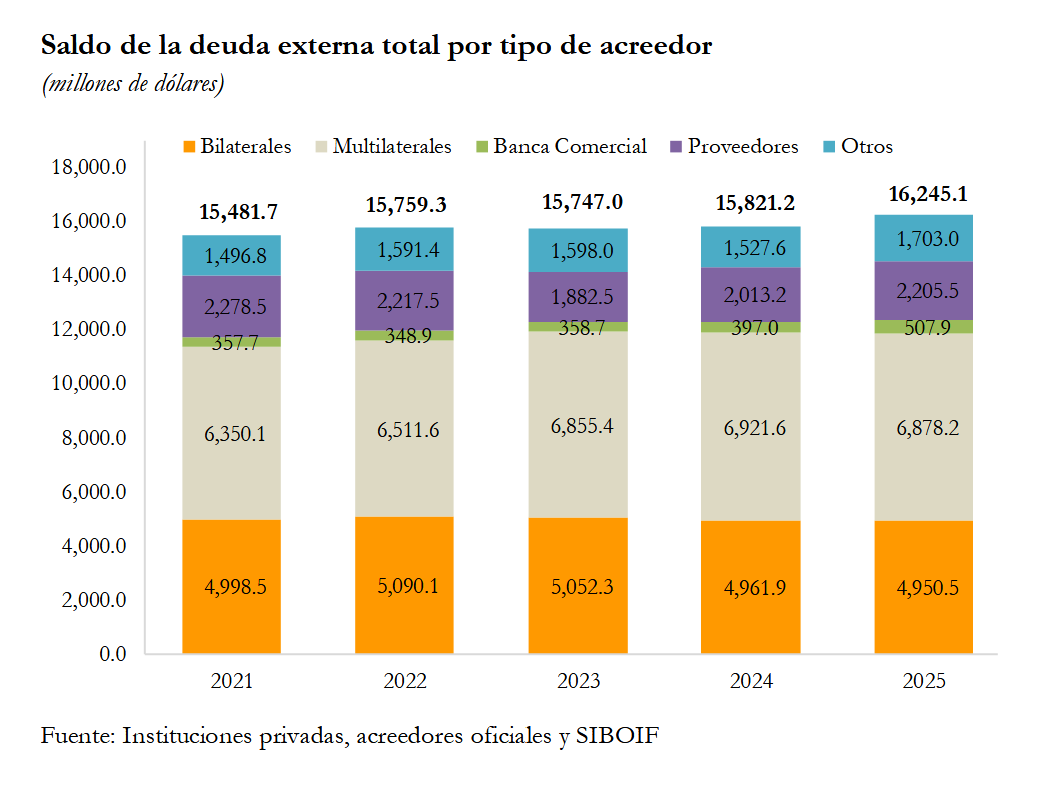 La deuda con acreedores oficiales (bilaterales y multilaterales) fue de 3,152.2 millones de dólares, siendo menor en 117.6 millones (-3.6%) respecto al 2024 (US$3,269.7 millones); mientras que la deuda con acreedores privados (banca comercial, proveedores y otros), que totalizó 4,256.3 millones de dólares, mostró un aumento de 362.6 millones (+9.3%) con relación al 2024 (US$3,893.8 millones).