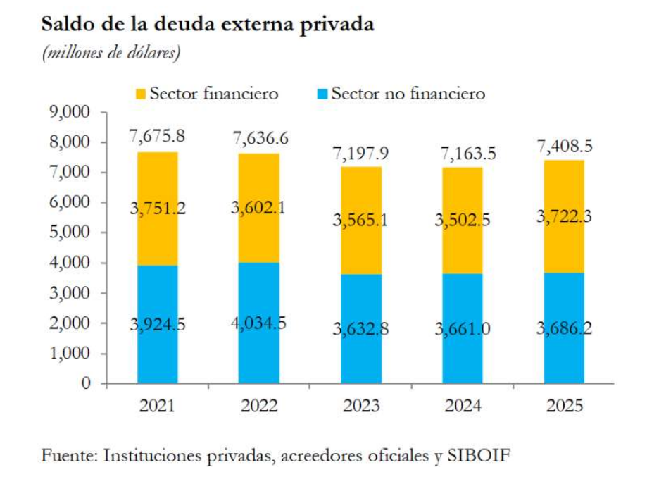 A diciembre de 2025, la deuda externa privada se ubicó en 7,408.5 millones de dólares, reflejando un aumento de 245.0 millones de dólares (+3.4%) con respecto al año 2024 (US$7,163.5 millones).