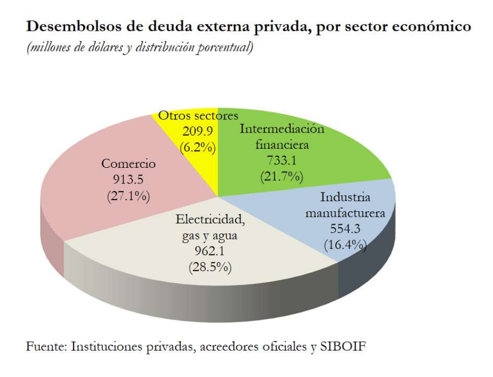 Los desembolsos provinieron principalmente de acreedores privados (US$3,3367.4 millones), de los cuales 71.6 por ciento fueron de proveedores y 28.3 por ciento de banca comercial y otros acreedores. Las principales actividades de destino de los desembolsos recibidos por el sector privado fueron: electricidad, gas y agua (28.5%), comercio (27.1%), intermediación financiera (21.7%), industria manufacturera (16.4%), minería (4.6%) y el resto de sectores (1.7%).