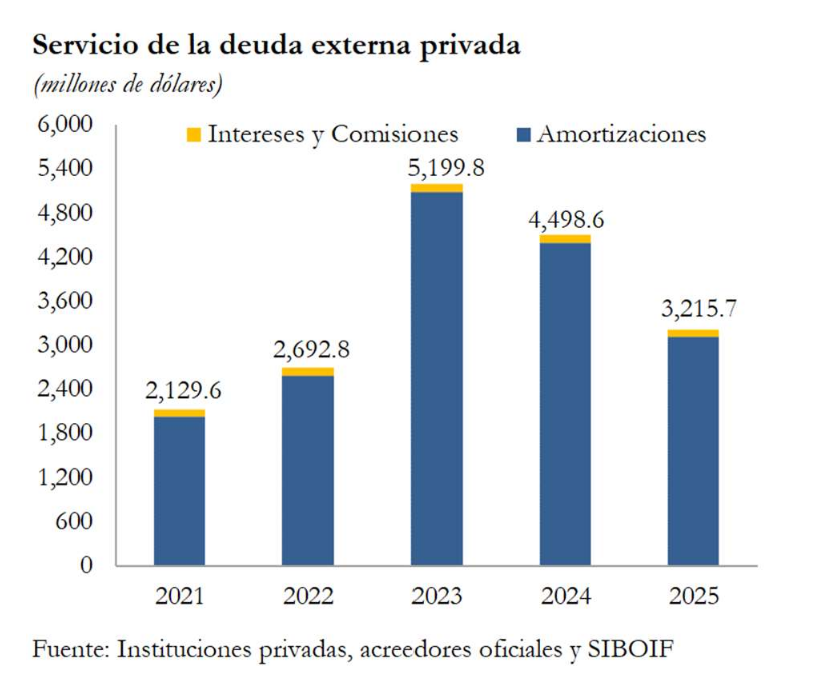 El servicio pagado de la deuda externa privada fue de 3,215.7 millones de dólares, 1,283.0 millones menos que en el 2024. Del total pagado, 3,124.7 millones de dólares correspondieron a amortizaciones y 91.0 millones de dólares a intereses y comisiones. El 76.5 por ciento del servicio fue por deuda de corto plazo (US$2,461.5 millones) y el 23.5 por ciento restante fue de mediano y largo plazo (US$754.1 millones).