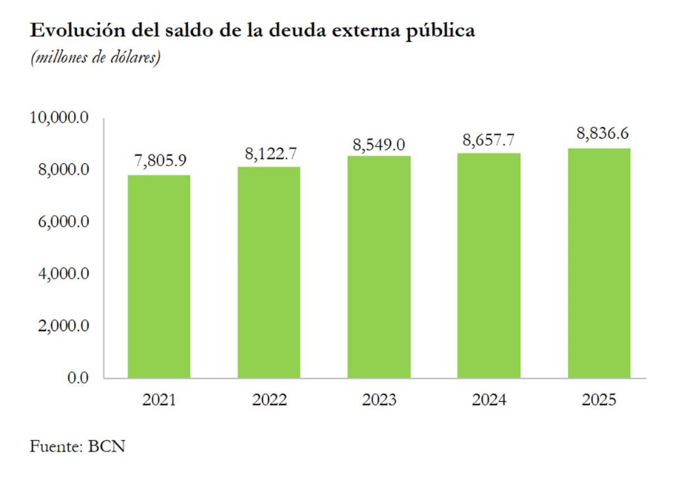 En 2025, el saldo de la deuda externa pública fue de 8,836.6 millones de dólares, registrando un incremento de 178.9 millones de dólares (+2.1%) con relación a 2024 (US$8,657.7 millones).