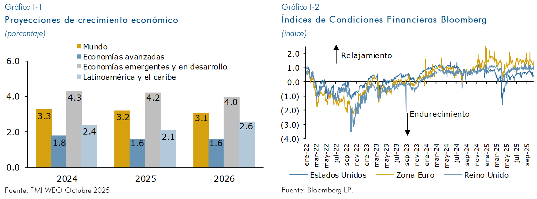 Las proyecciones más recientes para el crecimiento económico mundial anticipan una desaceleración durante 2025 y 2026, si bien más moderada que la prevista en meses previos, destacando el mejor desempeño de Estados Unidos y China. Por su parte, las condiciones financieras mundiales se mantienen favorables, gracias en parte a la depreciación del dólar estadounidense, mientras las instituciones financieras continúan demostrando una notable resiliencia. No obstante, los riesgos para la estabilidad financiera mundial se mantienen elevados producto de la incertidumbre relacionada con las tensiones geopolíticas y comerciales, las preocupaciones sobre la sostenibilidad fiscal de las principales economías, las elevadas valoraciones de activos, el mayor uso del apalancamiento por parte de las instituciones financieras no bancarias, entre otros.