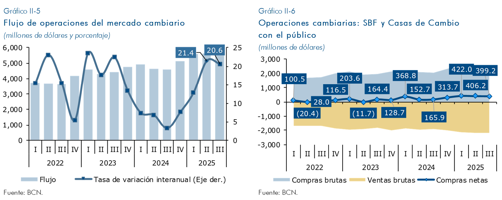 Por su parte, el contexto macroeconómico nacional favorable ha contribuido a un desempeño positivo de los mercados financieros, respecto al Informe de Estabilidad Financiera publicado en abril de 2025. Así, el flujo de operaciones del mercado cambiario continúa aumentando, de tal forma que, durante el segundo y tercer trimestre del año, el flujo total de operaciones alcanzó 11,132.9 millones de dólares, siendo un 21.0 por ciento superior al del mismo período del año anterior. Los bancos, financieras y casas de cambio registraron mayores compras netas de divisas con el público, impulsadas por la mayor demanda del gobierno, el cual a su vez realizó compras netas al sistema financiero. En cuanto a la brecha de tipo de cambio, esta se mantuvo en torno al 0.7 por ciento, nivel inferior al 2 por ciento de la comisión de venta de divisas por parte del BCN.