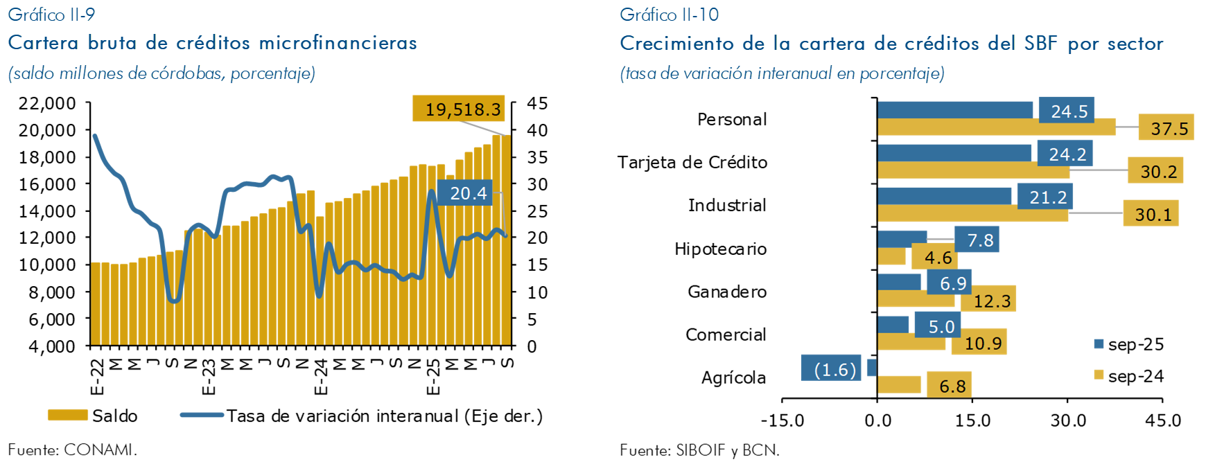 Con respecto al Informe de Estabilidad Financiera de abril de 2025, los mercados financieros continúan mostrando estabilidad en sus principales variables. Así, el flujo de operaciones del mercado cambiario continúa aumentando, mientras la brecha de tipo de cambio, se mantiene en torno al 0.7 por ciento, nivel inferior al 2 por ciento de la comisión de venta de divisas por parte del BCN. En el mercado de valores se observa un aumento interanual en los volúmenes negociados, explicado principalmente por mayores transacciones de valores públicos. El mercado crediticio mantiene un desempeño dinámico, con la cartera consolidada de bancos, financieras y microfinancieras creciendo 13.5 por ciento en términos interanuales a septiembre de 2025. En el mercado inmobiliario, se observa una clara tendencia al alza de la cartera de crédito hipotecaria. Finalmente, el mercado de seguros continúa siendo favorecido por la mayor actividad económica y crediticia, registrando las primas netas emitidas creciendo a dos dígitos.