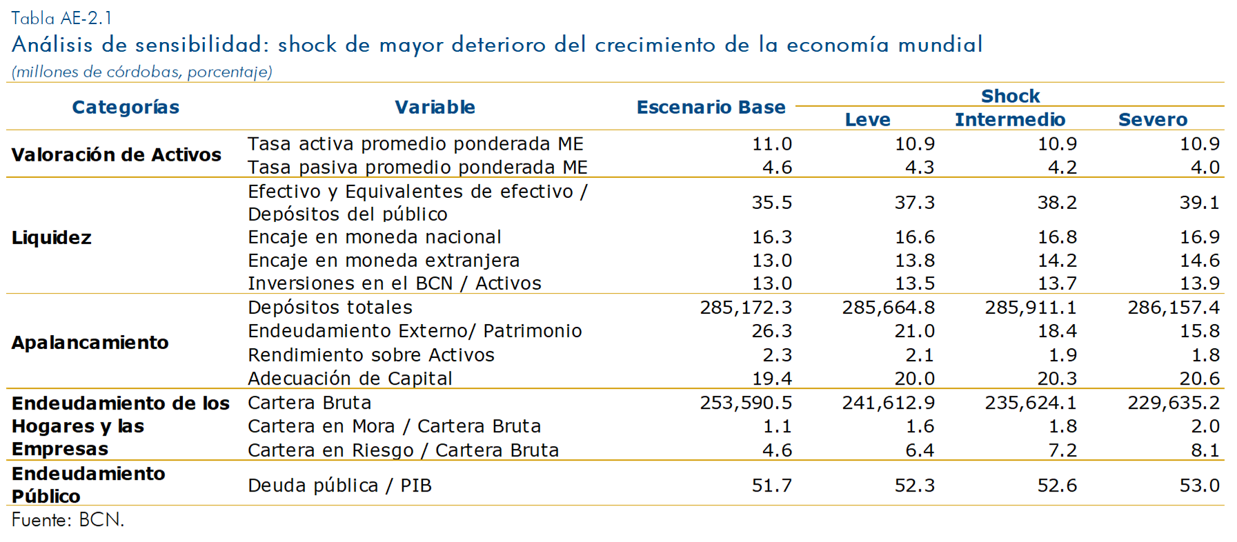 Los resultados presentados en la tabla AE-2.1 muestran que, a mayor magnitud del choque, se estima que se experimentaría una mayor reducción del saldo de cartera bruta al igual que un mayor deterioro de su calidad, reflejándose en un aumento tanto de la cartera en mora como de la cartera en riesgo. Adicionalmente, la reducción del crédito se reflejaría en una menor rentabilidad del sistema. Por otro lado, los depósitos se mantendrían relativamente estables y los fondos disponibles se canalizarían principalmente hacia la reducción del endeudamiento externo y mayores inversiones en el Banco Central de Nicaragua. No obstante, el sistema bancario y financieras mantiene una posición financiera sólida para afrontar estos escenarios, con una holgada adecuación de capital y ratios de liquidez, de forma que mantendría su capacidad de continuar con la actividad de intermediación financiera y de cumplir con los requerimientos regulatorios.