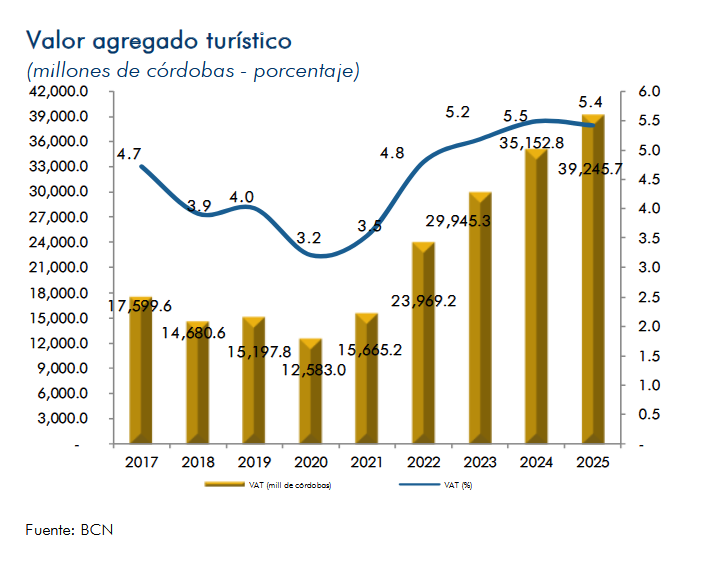 Como resultado de la producción, se generó un Valor Agregado Turístico (VAT) de 39,245.7 millones de córdobas, que representó 5.4 por ciento del valor agregado total de la economía, y registró un crecimiento de 11.6 por ciento con respecto al valor registrado en 2024 (C$ 35,152.8 millones).
