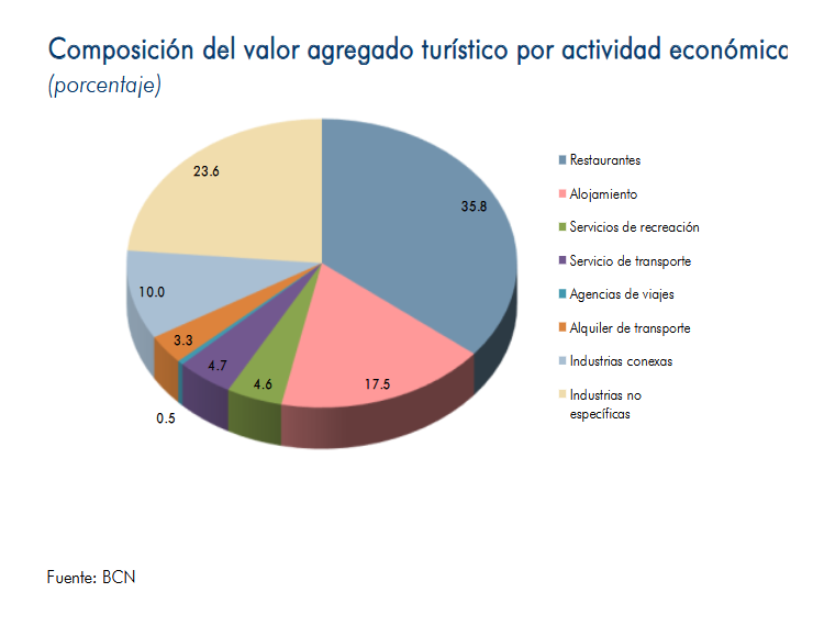 Las actividades de mayor participación en el valor agregado turístico fueron: servicios de restaurantes y similares (35.8%), servicios de alojamiento (17.5%), servicios de transporte y similares (8.5%) y recreación (4.6%). |
