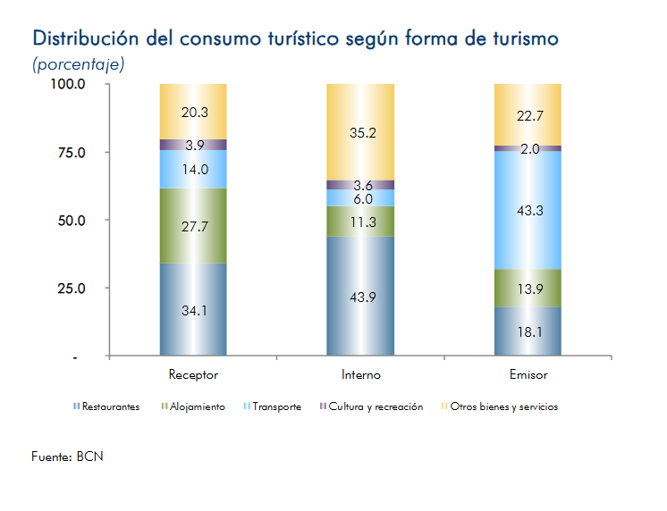 Del consumo turístico receptor, 34.1 por ciento correspondió al consumo de servicios de restaurantes, seguido de los servicios de alojamiento, 27.7 por ciento; servicios de transporte en sus diversas modalidades, 14.0 por ciento; y servicios de recreación, 3.9 por ciento; los que en conjunto representaron 79.7 por ciento del total. Por su parte, del total del consumo de los residentes en el país, 43.9 por ciento fue en servicios de restaurantes, 11.3 por ciento en servicios de alojamiento, 6.0 por ciento en servicios de transporte, y 35.2 por ciento en compra de otros bienes y servicios turísticos. En relación con el consumo turístico emisor, que corresponde al gasto realizado por los residentes que viajaron al exterior, éste se concentró en servicios de transporte (43.3%), compra de bienes y servicios (22.7%), servicios de restaurantes (18.1%) y servicios de alojamiento (13.9%).