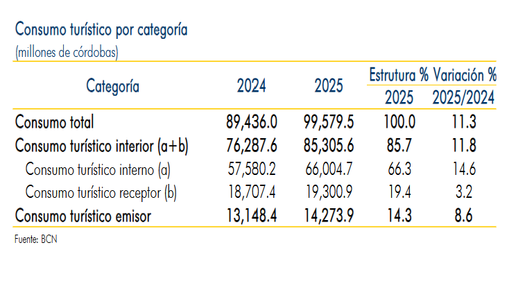 El gasto de consumo turístico, efectuado tanto dentro como fuera del país, fue de 99,579.5 millones de córdobas; del cual 85.7 por ciento correspondió al consumo efectuado en el país (C$ 85,305.6 millones) y el 14.3 por ciento por el consumo realizado en el exterior (turismo emisor). Del total del consumo turístico en el país, el 77.4 por ciento (C$ 66,004.7 millones) fue realizado por los residentes nacionales (consumo turístico interno), el cual registró un aumento de 14.6 por ciento con respecto al del año 2024 (C$ 57,580.2). Por su parte, el consumo turístico efectuado por visitantes no residentes (consumo turístico receptor) fue de 19,300.9 millones de córdobas, el cual representó el 22.6 por ciento del total del consumo turístico interior, y mostró un incremento interanual de 3.2 por ciento.
