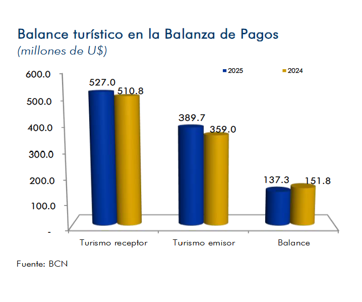 El balance turístico, es decir, la diferencia entre los ingresos del turismo receptor y los egresos del turismo emisor, fue de 137.3 millones de dólares menor en 9.6 por ciento en relación al registrado el año anterior (US$ 151.8 millones). El balance turístico, es decir, la diferencia entre los ingresos del turismo receptor y los egresos del turismo emisor, fue de 151.8 millones de dólares menor al registrado en el año anterior (US$432.9 millones).