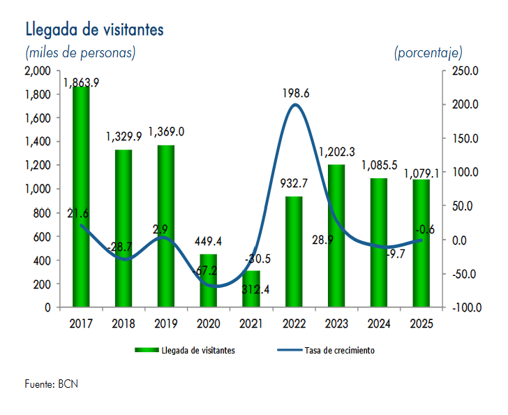 Durante el año 2025, la llegada de visitantes no residentes disminuyó 0.6 por ciento, equivalente a 6.4 mil personas menos que lo registrado en 2024. Del total de visitantes, 87.8 por ciento fueron turistas que pernoctaron al menos una noche y 12.2 por ciento correspondió a visitantes del día.