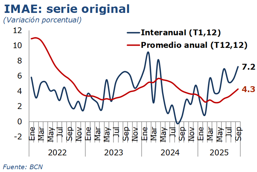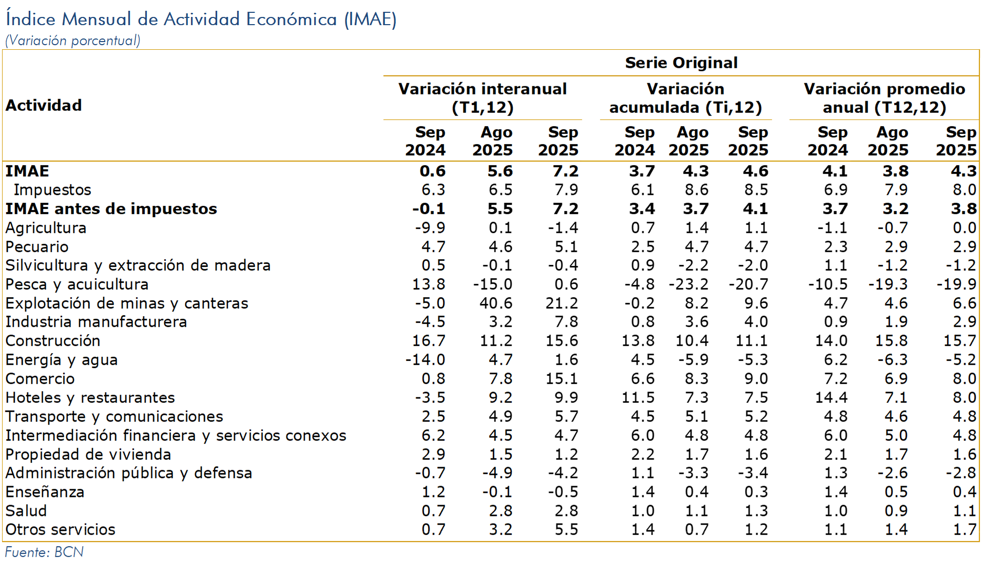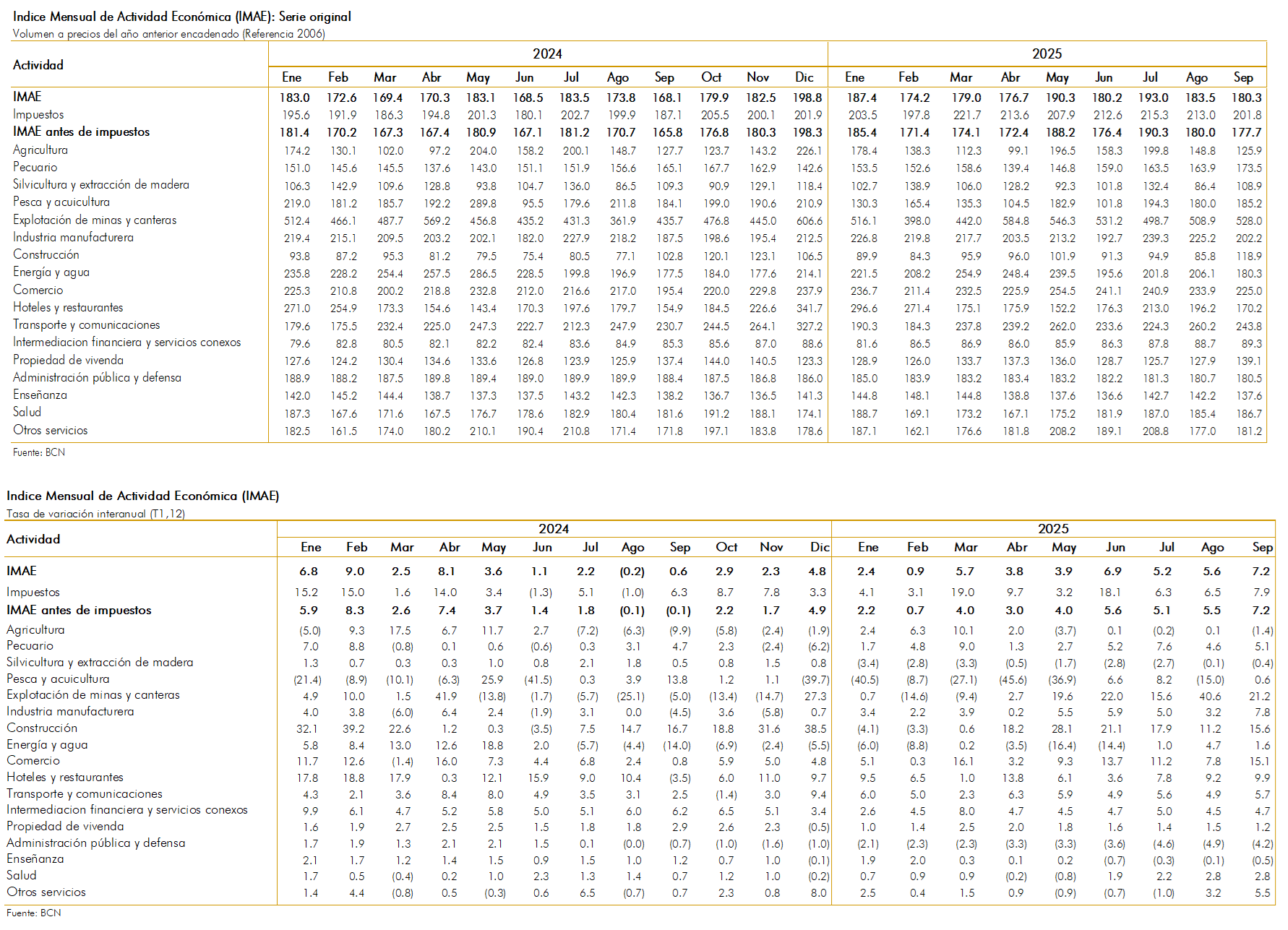 En septiembre, el Índice Mensual de Actividad Económica (IMAE), en su serie original, registró un crecimiento de 7.2 por ciento con relación a septiembre de 2024[2] , de 4.6 por ciento en la variación acumulada en el período enero-septiembre y de 4.3 por ciento en promedio anual.