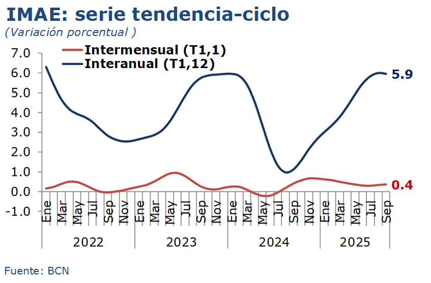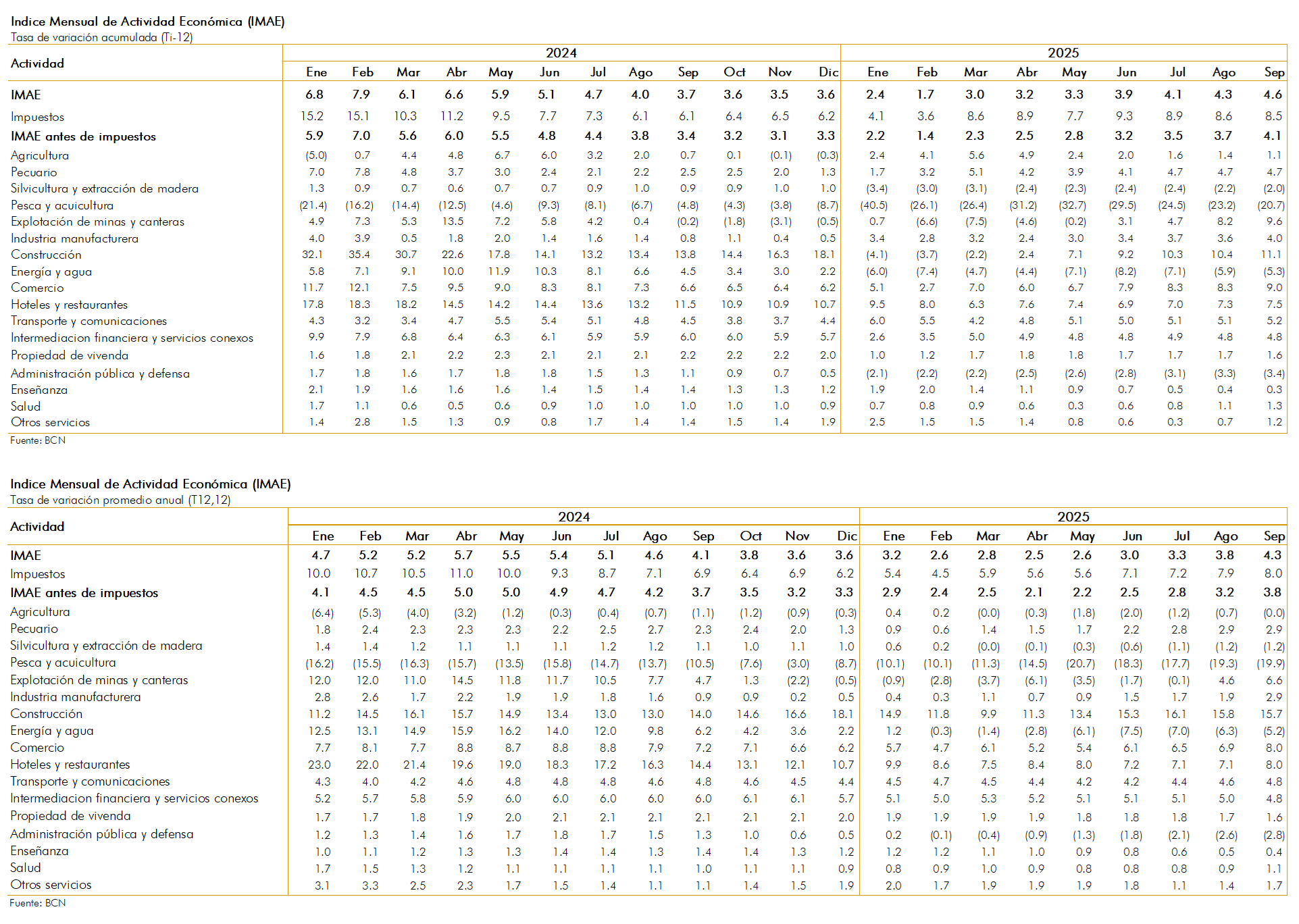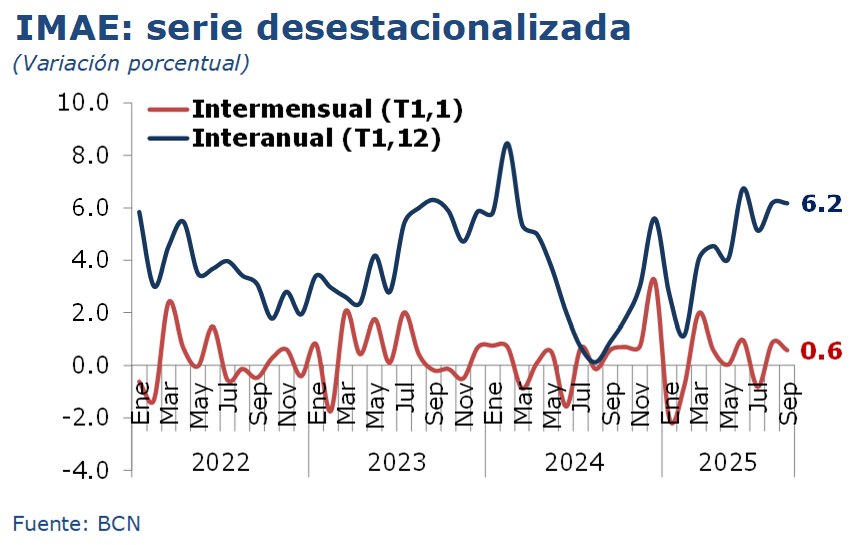 En la serie desestacionalizada del IMAE se registró un crecimiento de 0.6 por ciento respecto al mes anterior y de 6.2 por ciento con relación a septiembre de 2024. Por su parte, en la serie de tendencia-ciclo se observó un crecimiento de 0.4 por ciento con relación a agosto y de 5.9 por ciento respecto a septiembre de 2024.