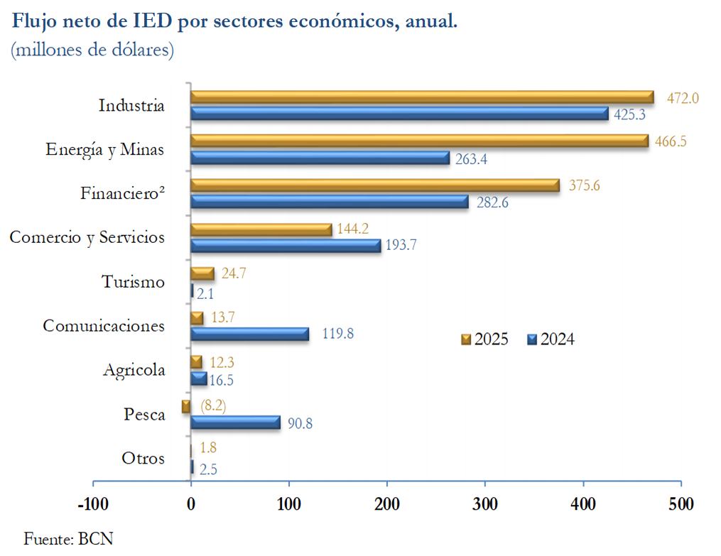 En 2025, los mayores flujos netos de IED se concentraron principalmente en las actividades de: industria manufacturera con 472.0 millones de dólares, representando el 31.4 por ciento del total, y el cual registró un aumento del 11.0 por ciento con respecto al 2024 (US$ 425.3 millones); seguido de las actividades de energía y minas con 466.5 millones de dólares (31.1 por ciento del total), que mostró un incremento interanual de 77.1 por ciento (US$ 263.4 millones en 2024); y en la actividad de intermediación financiera con 375.6 millones de dólares (25.0% del total), lo que representó un crecimiento de 32.9 por ciento respecto al año 2024 (US$ 282.6 millones).