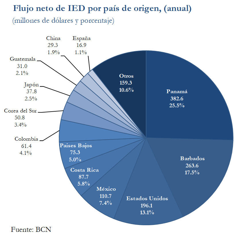 Por su parte, la IED neta proveniente de México fue de 110.7 millones de dólares (7.4% del total), canalizados principalmente a las actividades de comunicaciones, industria manufacturera y comercio. En tanto, los flujos netos de IED proveniente de Costa Rica se situaron en 87.7 millones de dólares (5.8% del total), concentrándose principalmente en las actividades de industria manufacturera y comercio y servicios. Los flujos netos procedentes de Países Bajos fueron de 75.3 millones de dólares (5.0% del total), orientados a las actividades de la industria manufacturera e intermediación financiera; y la IED neta de Colombia (US$ 61.4 millones; 4.1% del total) se concentró en las actividades de minería e industria manufacturera, principalmente.