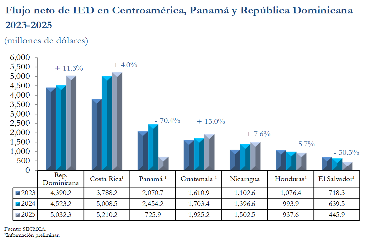 Durante el 2025, los flujos netos de IED que ingresaron a la región de Centroamérica, Panamá y República Dominicana fue de 15,779.6 millones de dólares, siendo menor en 5.6 por ciento (-US$ 939.8 millones) respecto a 2024. Los principales países receptores fueron Costa Rica (33.0%), República Dominicana (31.9% del total), Guatemala (12.2%) y Nicaragua (9.5%).