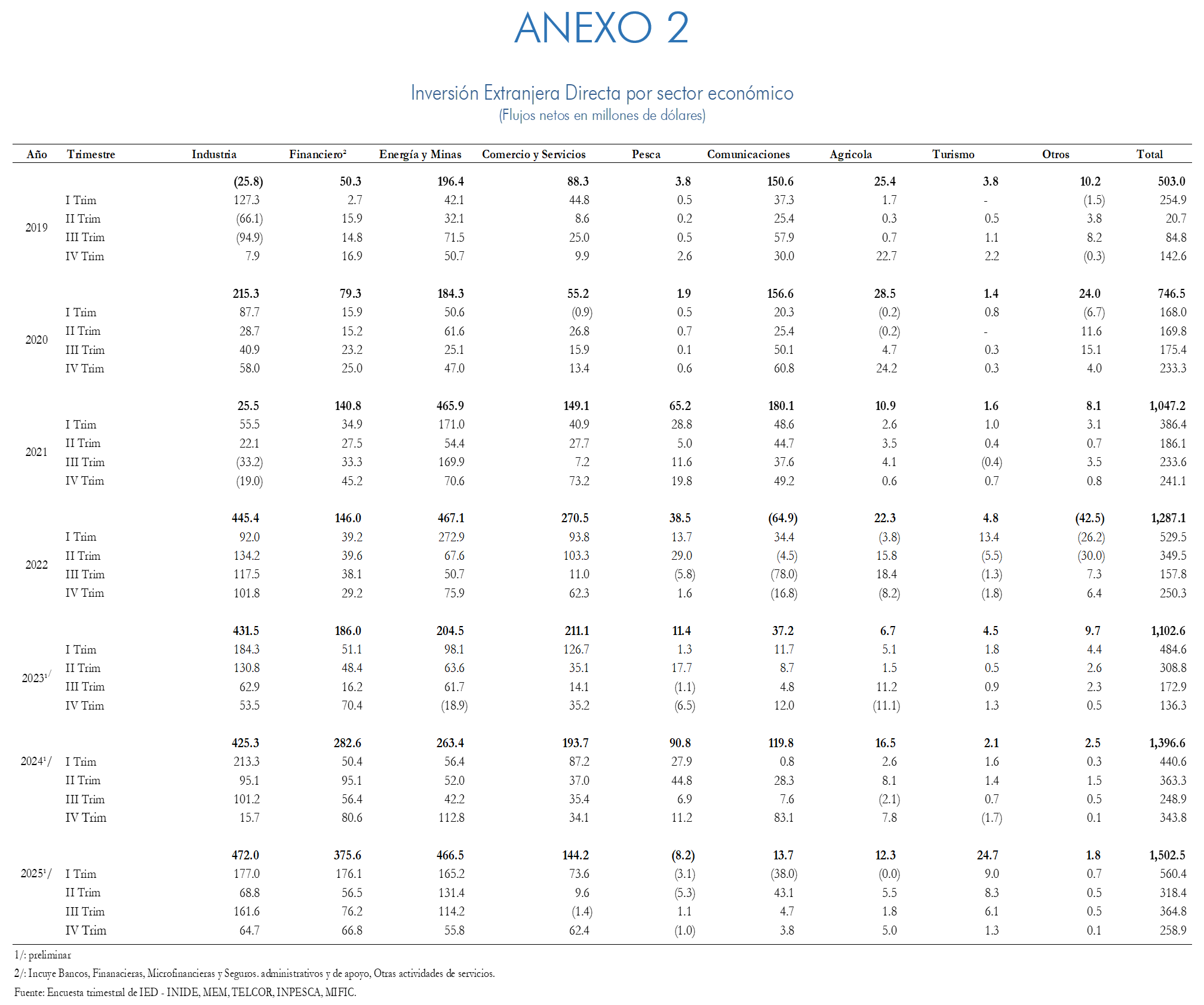Inversión Extranjera Directa en Nicaragua en el segundo semestre de 2025