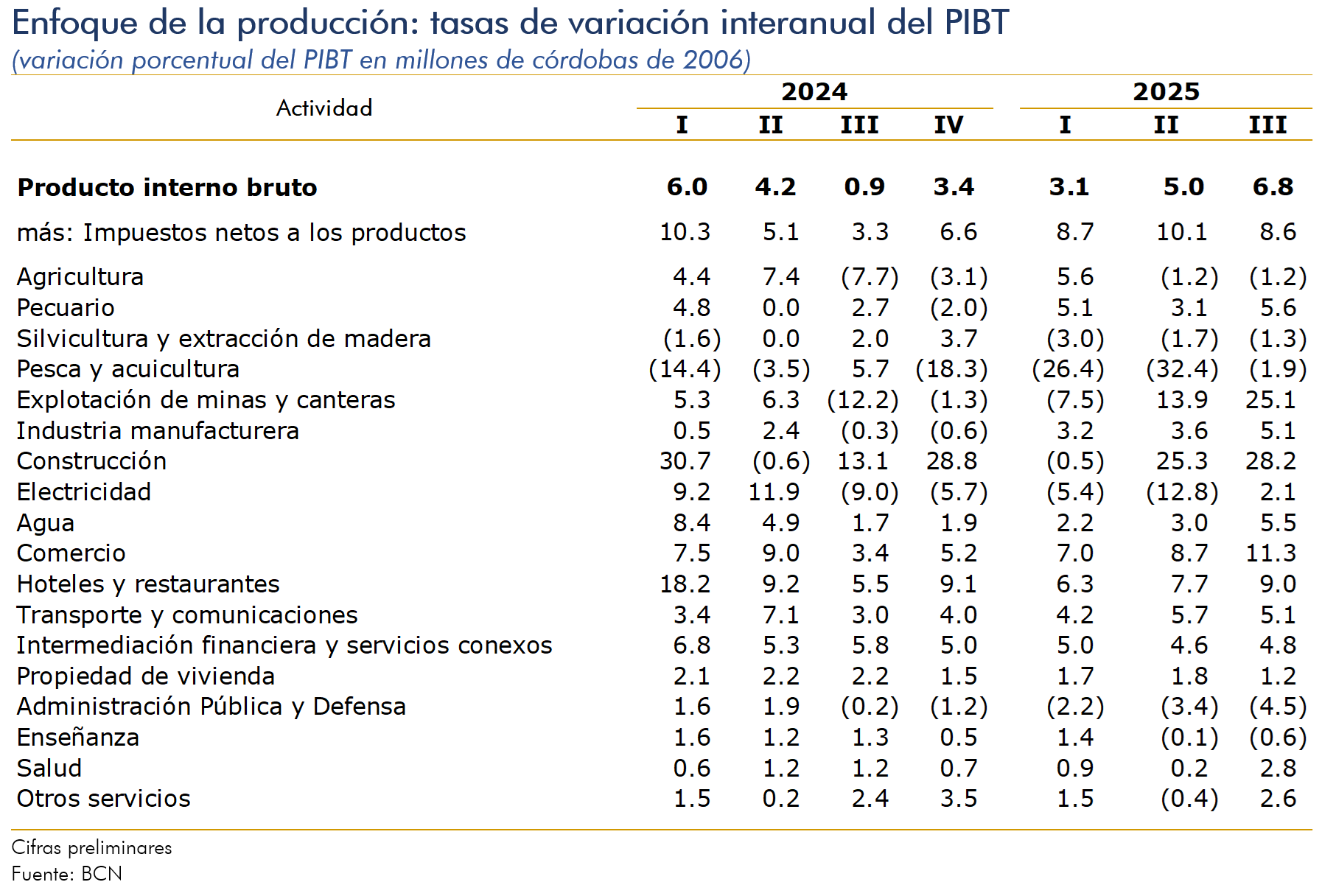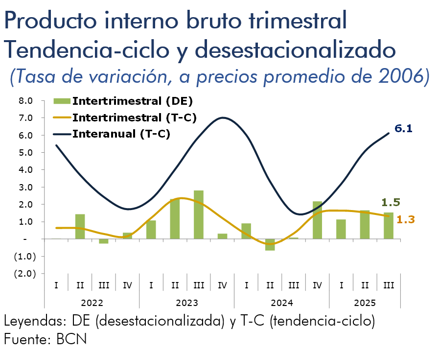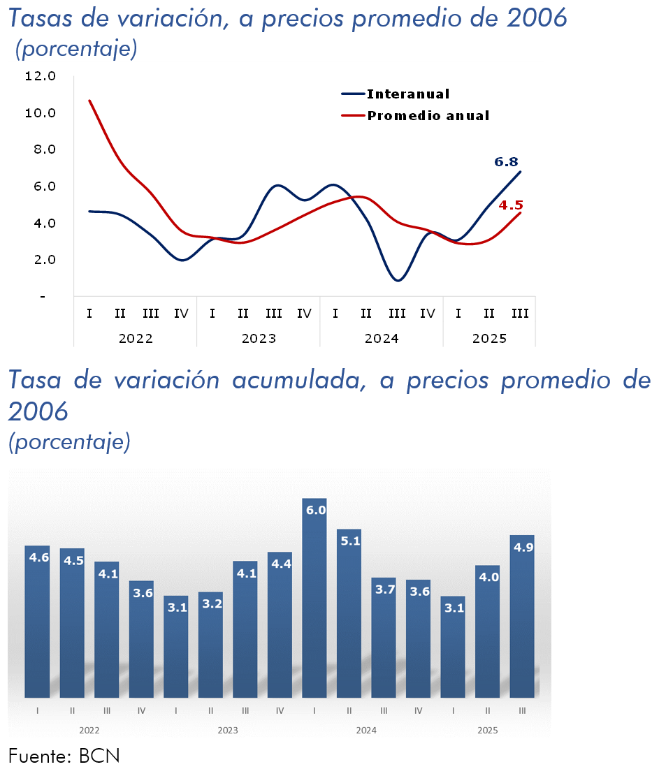 En el tercer trimestre de 2025, el Producto Interno Bruto registró un crecimiento interanual de 6.8 por ciento (5.0% en el trimestre anterior). Asimismo, el crecimiento acumulado al tercer trimestre del año se ubicó en 4.9 por ciento, según la estimación preliminar del PIB trimestral.