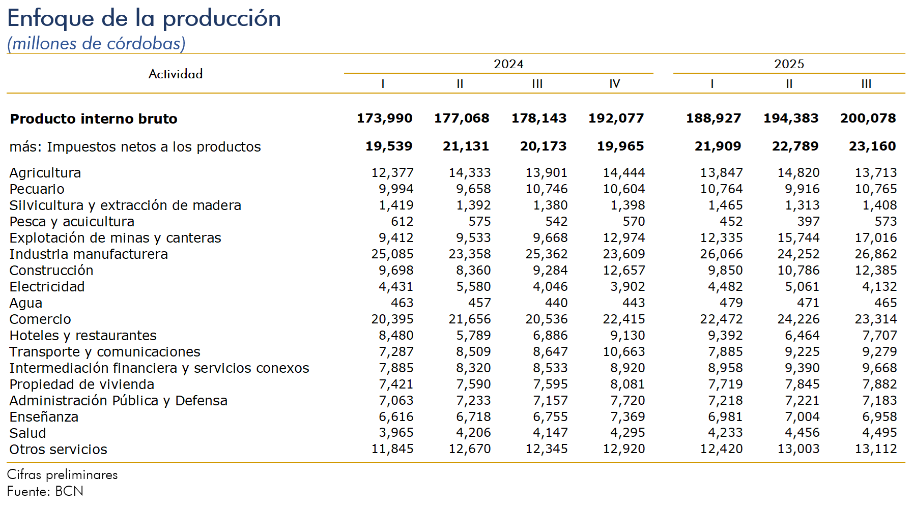 La agricultura disminuyó 1.2 por ciento (crecimiento de 0.9% en el acumulado al tercer trimestre), como resultado de las menores labores registradas en los cultivos de maíz, frijol, sorgo, arroz de secano, ajonjolí, maní, entre otros. La actividad pecuaria creció 5.6 por ciento (4.6% en el acumulado al tercer trimestre), debido a la mayor matanza vacuna, avícola y porcina; además del aumento en la exportación de ganado en pie. No obstante, se registró disminución en la producción de leche y huevos. La actividad de silvicultura y extracción de madera disminuyó 1.3 por ciento (-2.0% en el acumulado al tercer trimestre), como resultado de menor extracción de troncos de madera y leña. La pesca y acuicultura disminuyó 1.9 por ciento (-20.3% en el acumulado al tercer trimestre), debido principalmente a la menor producción de camarón de cultivo y captura de peces. Por otra parte, se registró aumento en la captura de langosta y cangrejo. La explotación de minas y canteras creció 25.1 por ciento (9.7% en el acumulado al tercer trimestre), como resultado de la mayor extracción de oro, material selecto, piedra triturada, yeso y toba; y disminuciones en la extracción de plata, arena, piedra cantera, hormigón y piedra pómez. La industria manufacturera creció 5.1 por ciento (4.0% en el acumulado al tercer trimestre). Este comportamiento fue resultado de la mayor producción en productos cárnicos, textiles, derivados de petróleo, no metálicos y arneses, principalmente. | La actividad de construcción creció 28.2 por ciento (17.1% en el acumulado al tercer trimestre), como resultado de una mayor construcción privada y pública. La construcción privada registró aumento en el área efectivamente construida en los destinos de construcción residencial y servicios; y disminución en la construcción de comercio e industria. Por su parte, en la construcción pública se observó crecimiento en las obras de ingeniería civil y en las edificaciones no residenciales. La generación de electricidad creció 2.1 por ciento (-6.1% en el acumulado al tercer trimestre), debido a la mayor generación de energía eólica, termoeléctrica y sistema aislado, principalmente. El servicio de agua registró un crecimiento de 5.5 por ciento (3.5% en el acumulado al tercer trimestre). El comercio creció 11.3 por ciento (9.0% en el acumulado al tercer trimestre), como resultado del aumento del comercio al por mayor y al por menor. La actividad de hoteles y restaurantes creció 9.0 por ciento (7.5% en el acumulado al tercer trimestre), impulsado por la mayor demanda de dichos servicios. La actividad de transporte y comunicaciones creció 5.1 por ciento (5.1% en el acumulado al tercer trimestre), debido a aumentos, tanto en los servicios de transporte, como en la actividad de comunicación. |