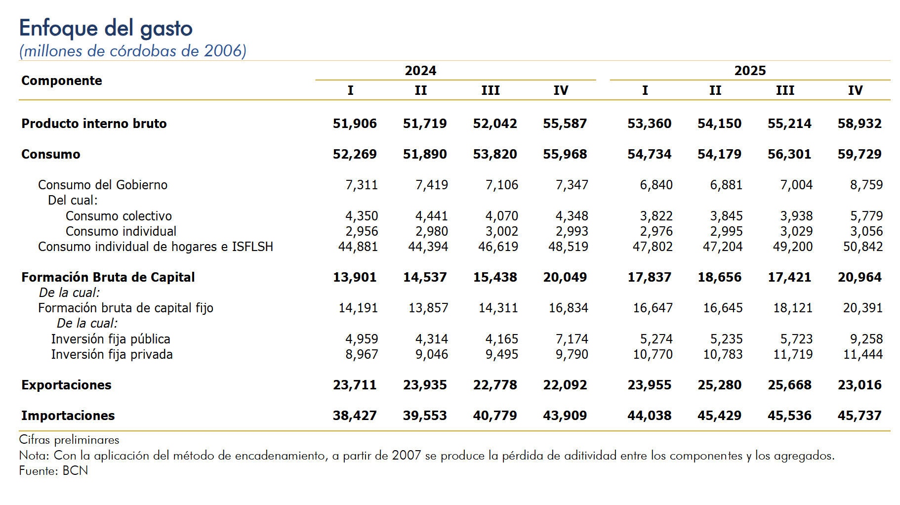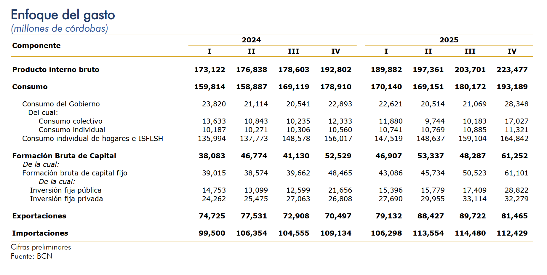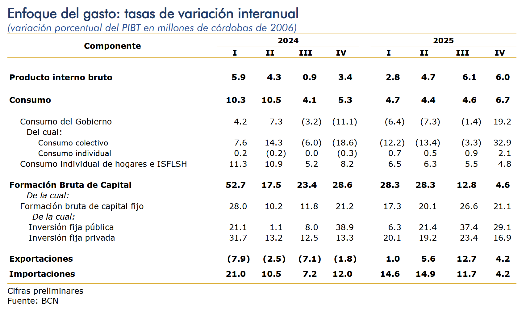 En el tercer trimestre, el consumo mostró un crecimiento interanual de 6.7 por ciento (5.1% en promedio anual), debido al incremento del consumo privado y del consumo público. El consumo individual de hogares e Instituciones Sin Fines de Lucro que Sirven a los Hogares (ISFLSH) o consumo privado registró un crecimiento interanual de 4.8 por ciento (5.8% en promedio anual); explicado, en parte, por el incremento en el crédito de consumo y el empleo. Por su parte, el consumo del gobierno registró un crecimiento de 19.2 por ciento (1.0% en promedio anual), resultado del crecimiento del consumo individual, 2.1 por ciento, y del consumo colectivo, 32.9 por ciento. La formación bruta de capital (FBK) registró un crecimiento de 4.6 por ciento (17.1% en promedio anual). Por su parte, la formación bruta de capital fijo (FBKF)o inversión fija mostró un crecimiento de 21.1 por ciento (21.3% en promedio anual); y en los inventarios se registró una menor acumulación respecto a igual periodo del año 2024. La evolución registrada en la formación bruta de capital fijo fue resultado del crecimiento en todos sus componentes: construcción (27.2%), maquinaria y equipo (13.2%), y en otras inversiones (38.4%). | De igual manera, en la inversión fija privada se registró un crecimiento de 16.9 por ciento (19.9% en promedio anual), como resultado del crecimiento en construcción (18.9%), en maquinaria y equipo (10.9%) y en otras inversiones (38.4%). Por su parte, la inversión fija pública registró un crecimiento de 29.1 por ciento (23.7% en promedio anual), como resultado del crecimiento en construcción (32.1%), maquinaria y equipo (20.4%), y en otras inversiones (10.6%). Las exportaciones de bienes y servicios registraron un crecimiento de 4.2 por ciento (5.8% en promedio anual). En los bienes, se registró crecimiento en la exportación de café, carnes y pescados, tabaco, productos no metálicos, maquinaria y equipo, entre otros; y disminución en las exportaciones de bebidas, tabaco, productos de madera, no metálicos, entre otros. En las exportaciones de servicios se registró aumentos en los servicios de aeropuerto, puertos marítimos, servicios de postales y correos, compras por no residentes, entre otros. Por su parte, las importaciones de bienes y servicios registraron un crecimiento de 4.2 por ciento (11.1% en promedio anual). En los bienes, se observó crecimiento en la importación de azúcar, productos de madera, no metálicos, metálicos, y maquinaria y equipo de transporte, entre otros; y disminución en la importación de bebidas, derivados de petróleo, entre otros. Por otra parte, en los servicios se registró crecimiento en los servicios postales y de correos, servicios de esparcimiento, culturales y deportivos, y servicios de comunicaciones entre otros. |