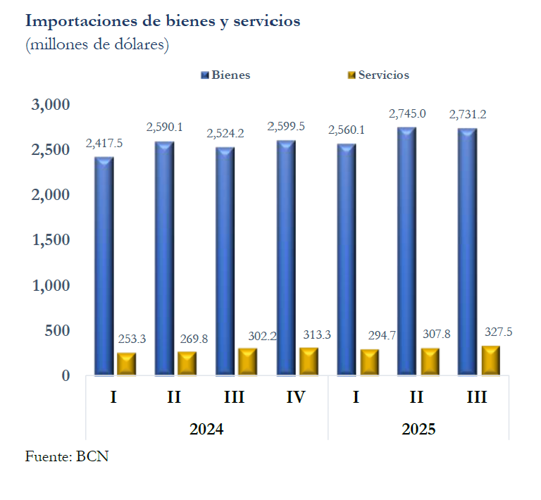 En términos acumulados, las importaciones de bienes totalizaron 8,036.3 millones de dólares al tercer trimestre, para un incremento de 6.7 por ciento con respecto igual período del año 2024; y las importaciones de servicios sumaron 1,061.2 millones de dólares, reflejando un incremento interanual de 14.1 por ciento.