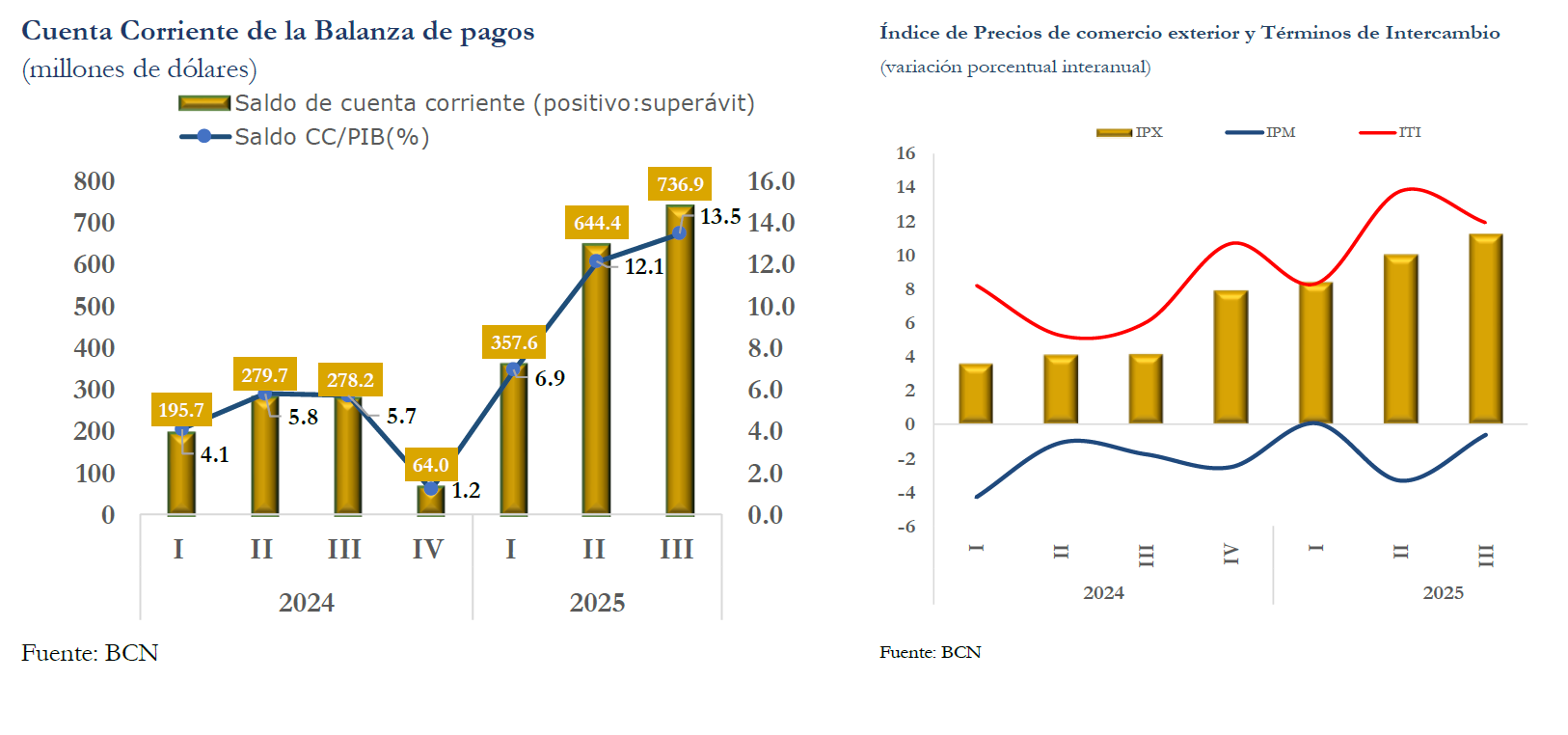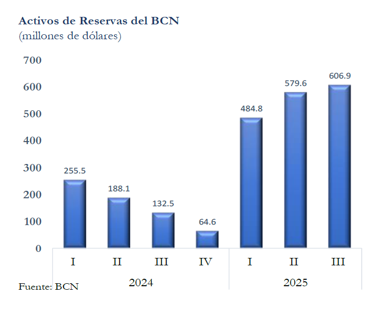 Los activos de reserva del BCN aumentaron 606.9 millones de dólares en el tercer trimestre de 2025 (US$615.5 millones en RIB); y 1,671.3 millones en el periodo enero-septiembre, que en términos de RIB significó un incremento acumulado de 1,716.5 millones de dólares, las que finalizaron con un saldo de 7,821.6 millones de dólares.