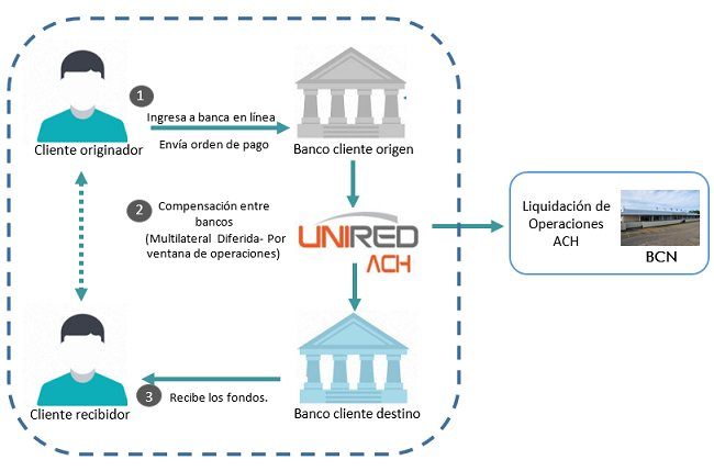 Si bien las transferencias electrónicas realizadas en ACH ordenadas por los clientes de los bancos, son liquidadas bajo un esquema de liquidación bruta en tiempo real, los saldos netos resultantes de dichas operaciones se liquidan en el BCN de forma diferida en dos ventanas de operación en el día, aplicando los débitos y créditos respectivos en las cuentas corrientes de liquidación que los bancos tienen en el BCN.