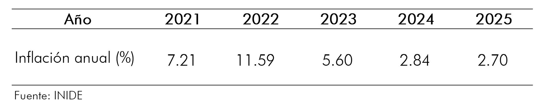 El Banco Central de Nicaragua (BCN) informa que, con base en los datos reportados por el Instituto Nacional de Información de Desarrollo (INIDE), la inflación acumulada en 2025, medida por la variación del Índice de Precios al Consumidor (IPC), fue de 2.70 por ciento, menor a la registrada en 2024 que fue de 2.84 por ciento.